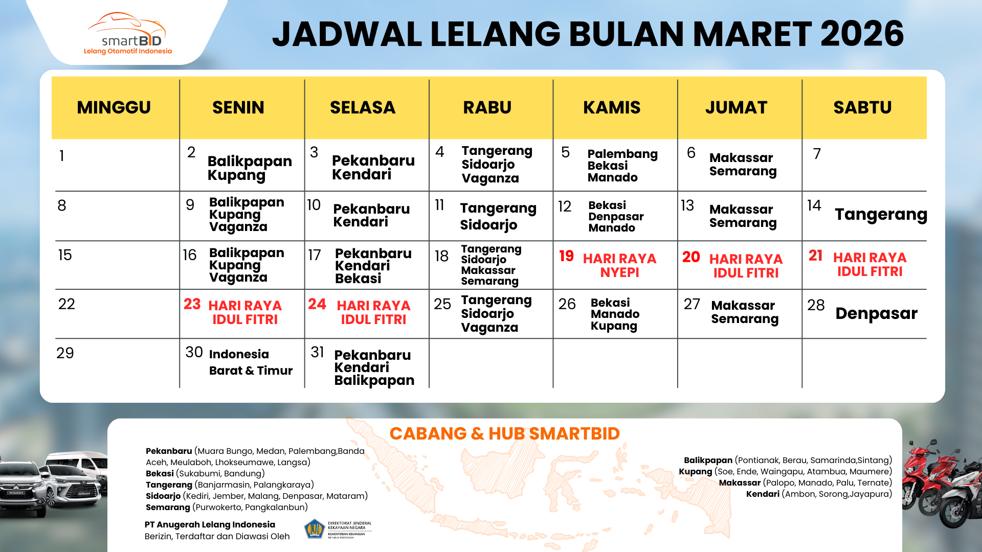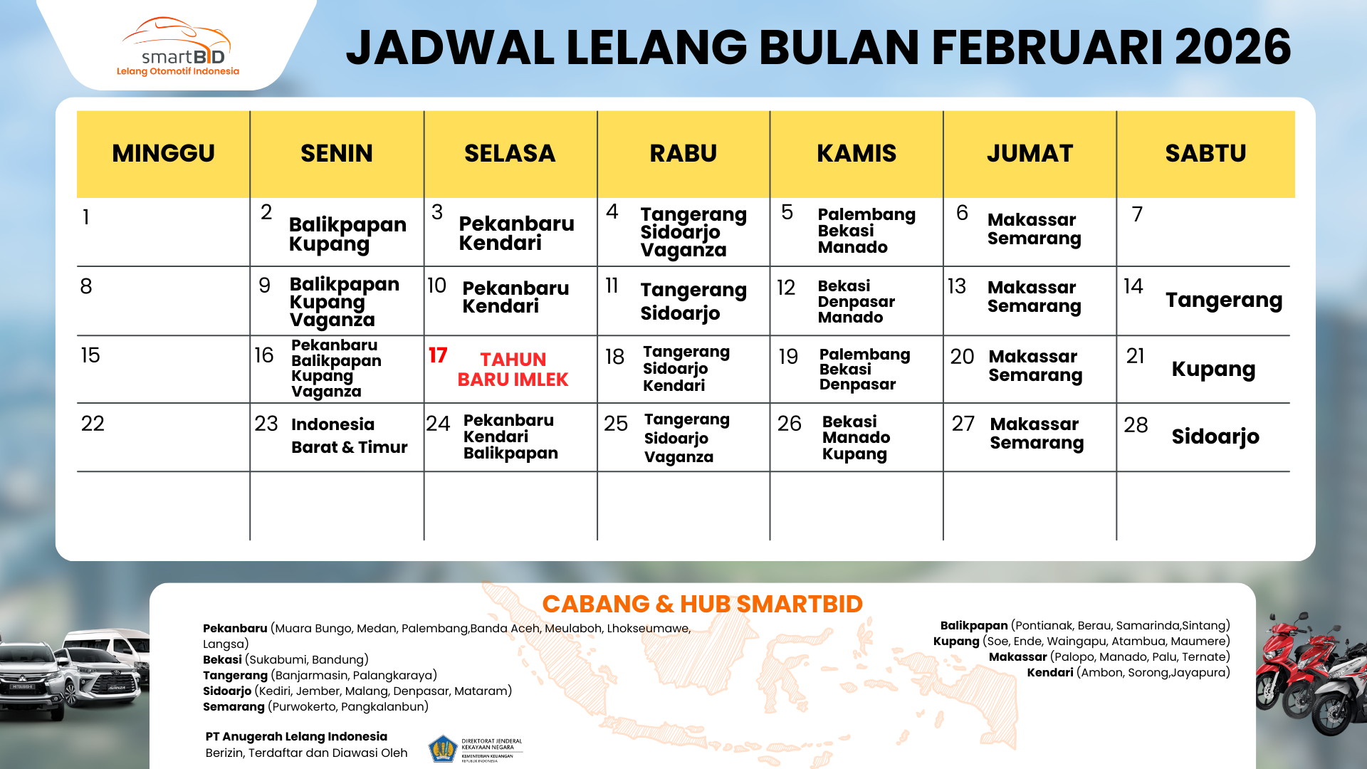 SmartBID telah hadir di 24 Kota yang tersebar di seluruh Indonesia sehingga lebih memudahkan Anda dalam melakukan chek unit.