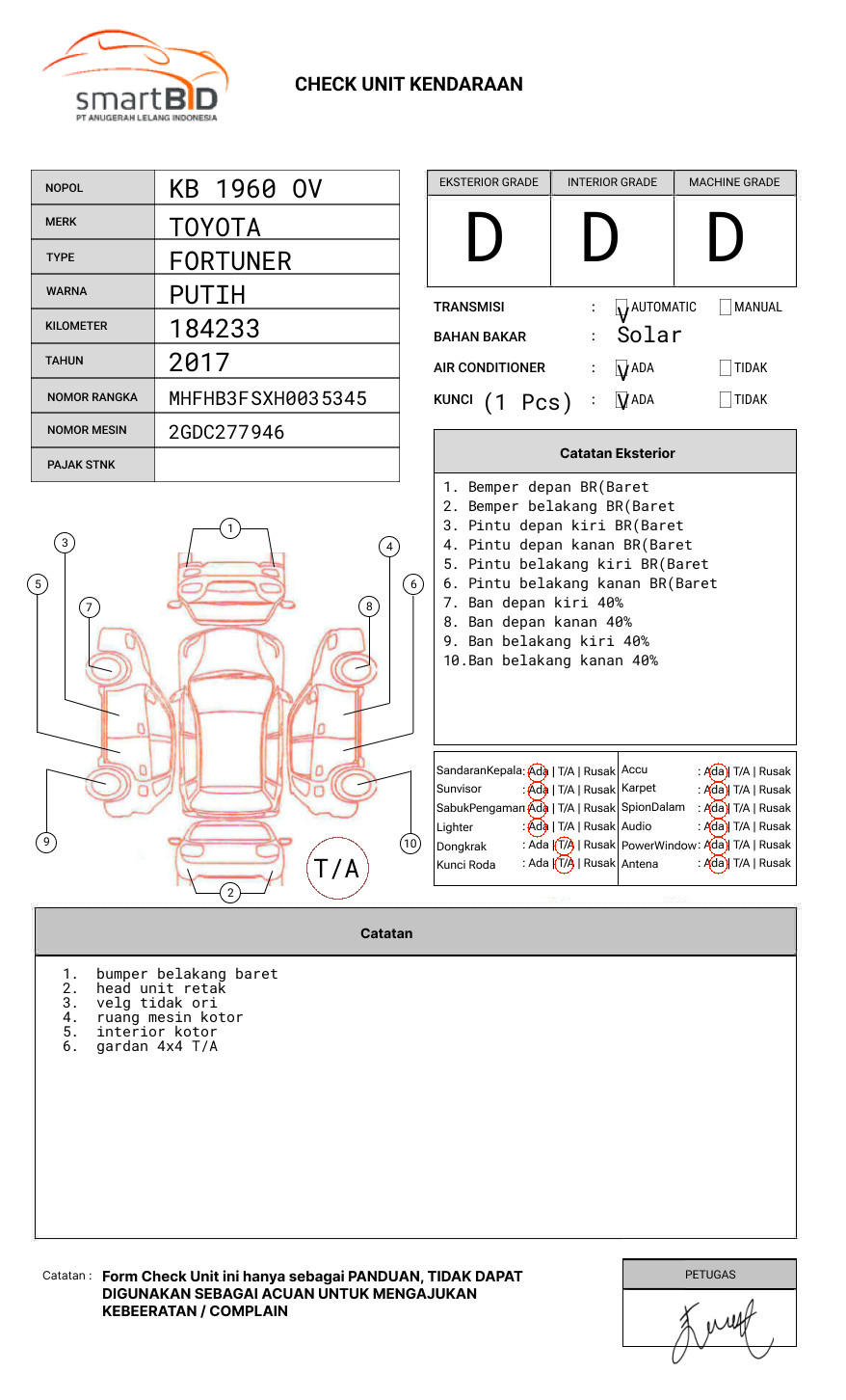 SEBELUM MELAKUKAN PENAWARAN UNIT PESERTA LELANG WAJIB MELAKUKAN PENGECEKAN UNIT DAN DOKUMEN TERLEBIH DAHULU // PIC FELIX +62 858-2222-4863 // UNIT DIKENAKAN BIAYA PPN 1.1% DARI HARGA TERBENTUK // DIGIT BELAKANG NOSIN TIDAK JELAS//NOPOL FISIK TA