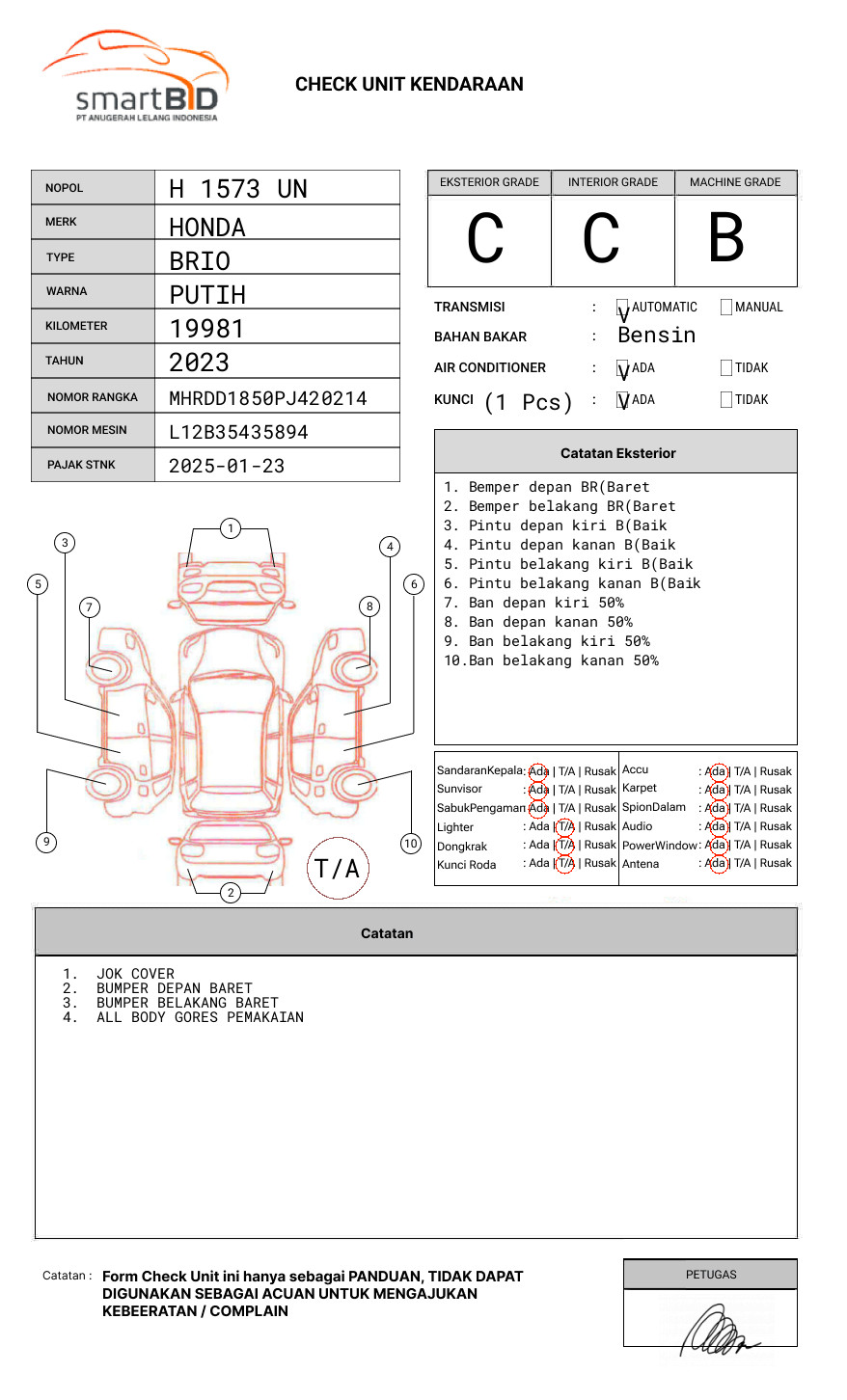 SEBELUM MELAKUKAN PENAWARAN UNIT PESERTA LELANG WAJIB MELAKUKAN PENGECEKAN UNIT DAN DOKUMEN TERLEBIH DAHULU // PIC TIAN : +62 896-6265-5959 // UNIT DIKENAKAN BIAYA PPN 1.1% DARI HARGA TERBENTUK //