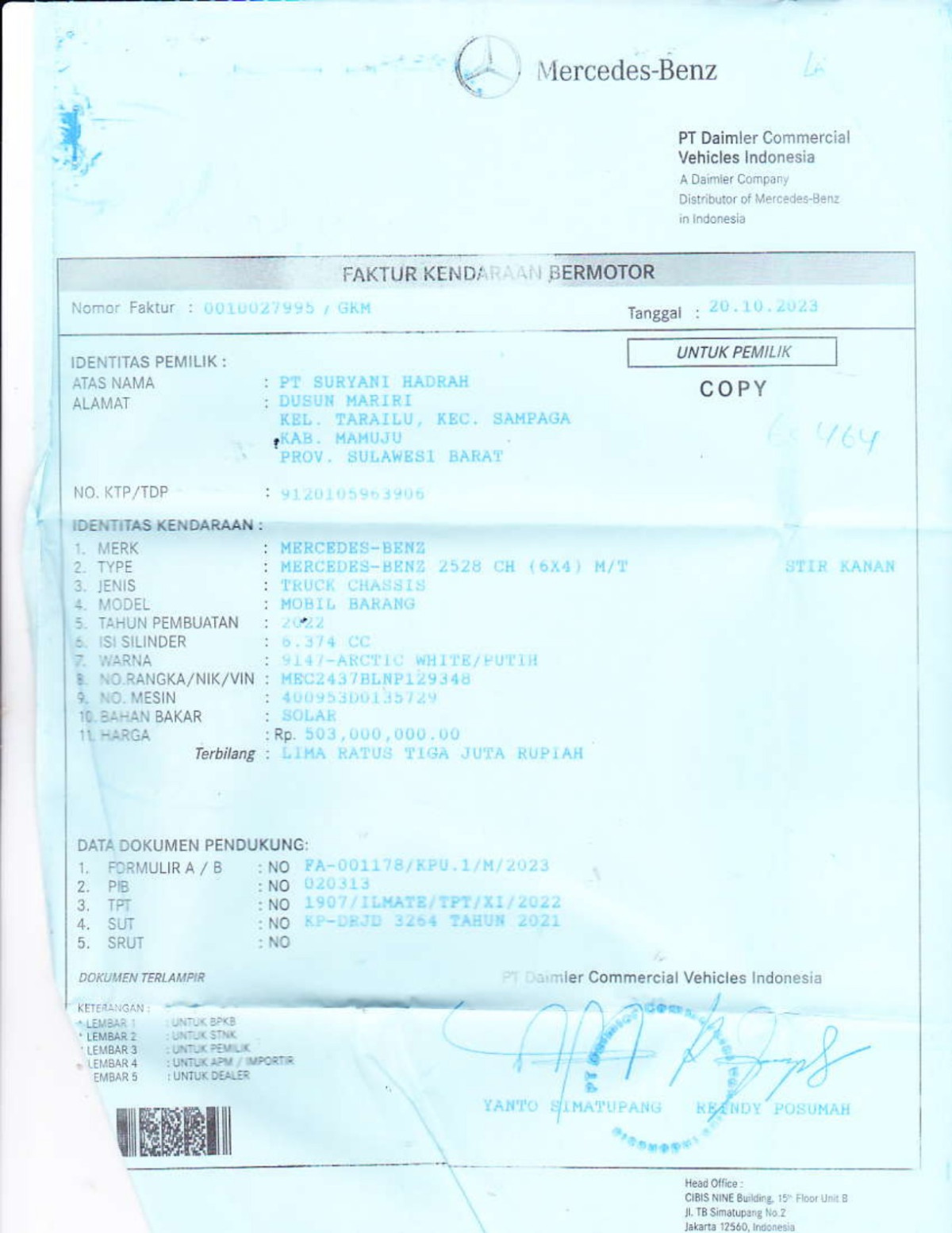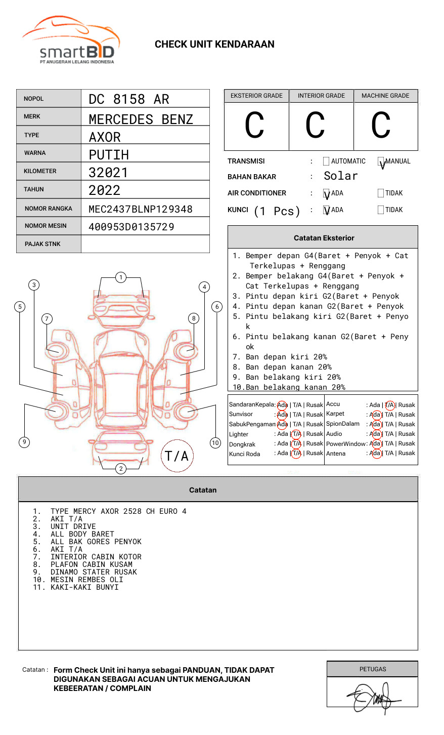 SEBELUM MELAKUKAN PENAWARAN UNIT PESERTA LELANG WAJIB MELAKUKAN PENGECEKAN UNIT DAN DOKUMEN TERLEBIH DAHULU // PIC AHMAD +62 823-4527-8181//UNIT DIKENAKAN BIAYA PPN 1,1% DARI HARGA TERBENTUK // NOPOL FISIK T/A