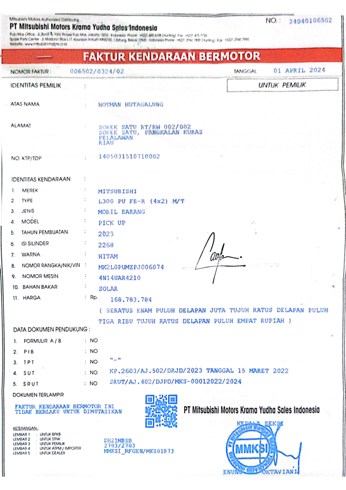 No. Rangka | : | MK2L0PUMZPJ006074 |