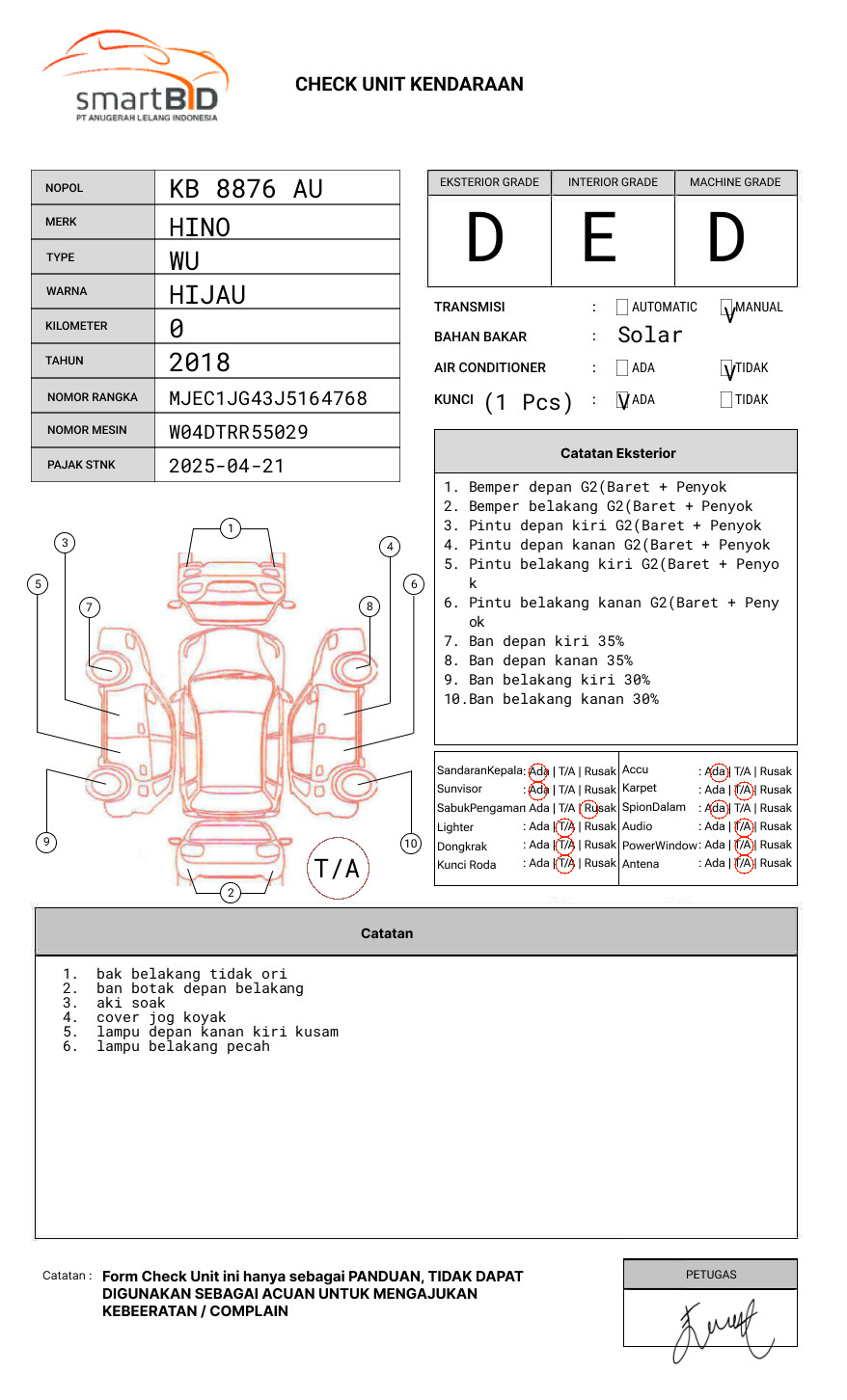 SEBELUM MELAKUKAN PENAWARAN UNIT PESERTA LELANG WAJIB MELAKUKAN PENGECEKAN UNIT DAN DOKUMEN TERLEBIH DAHULU // PIC FELIX +62 858-2222-4863 //UNIT DIKENAKAN BIAYA PPN 1.1% DARI HARGA TERBENTUK // NOPOL FISIK TA // FAKTUR DALAM BENTUK FOTOCOPY