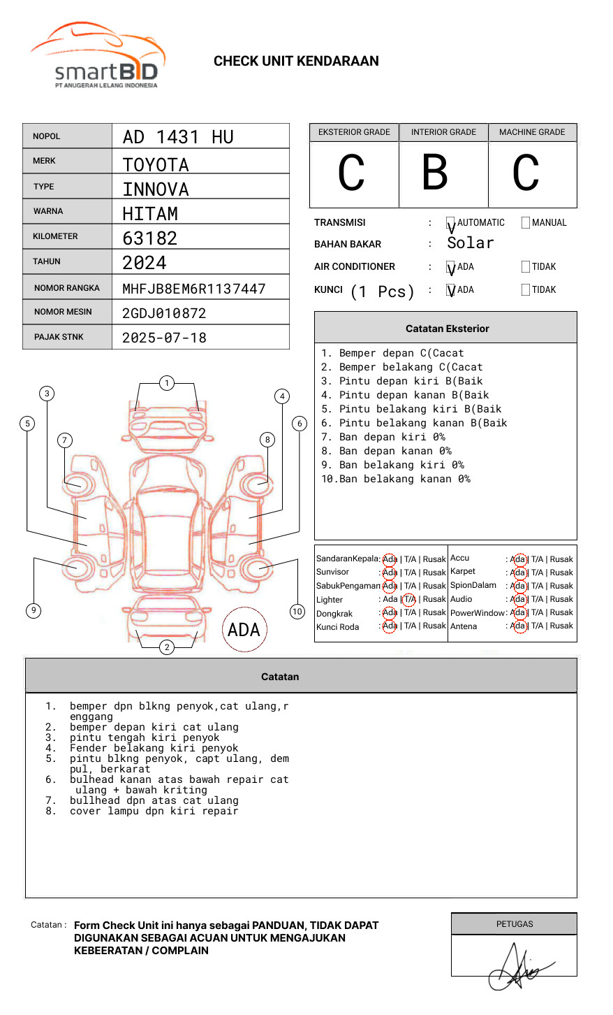 SEBELUM MELAKUKAN PENAWARAN HARAP CEK KONDISI UNIT SERTA DOKUMEN TERLEBIH DAHULU// UNIT DIKENAKAN BIAYA PPN 1,2 % DARI HARGA TERBENTUK/// PIC TOYIB : 081332024730