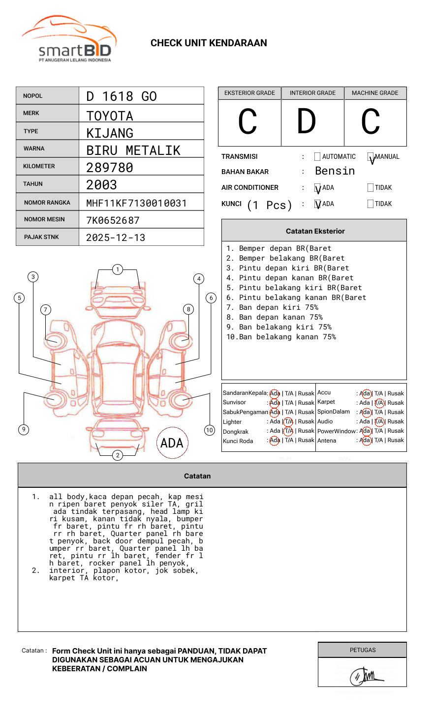 SEBELUM MELAKUKAN PENAWARAN UNIT PESERTA LELANG WAJIB MELAKUKAN PENGECEKAN UNIT DAN DOKUMEN TERLEBIH DAHULU // PIC DENNY : 0852-9442-5362 // UNIT DIKENAKAN BIAYA PPN 1.1% DARI HARGA TERBENTUK //