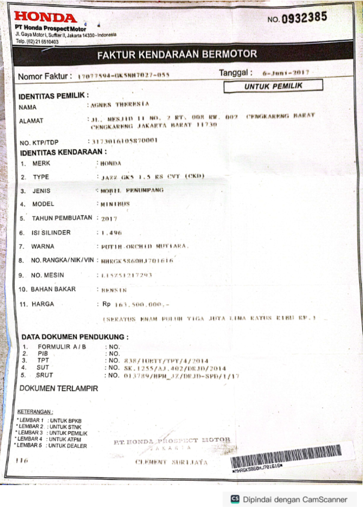 | No. Rangka | : | MHRGK5860HJ701616 |