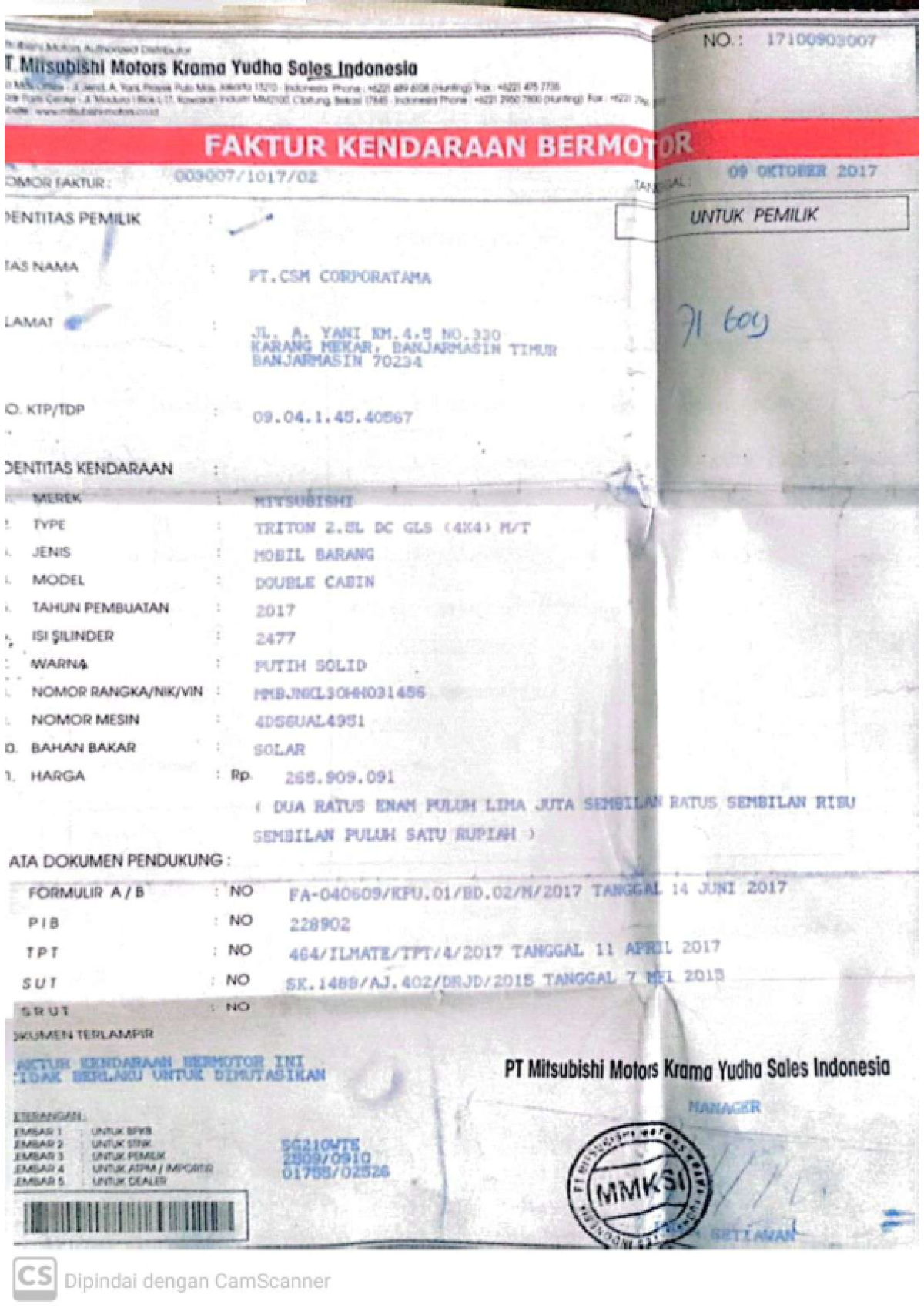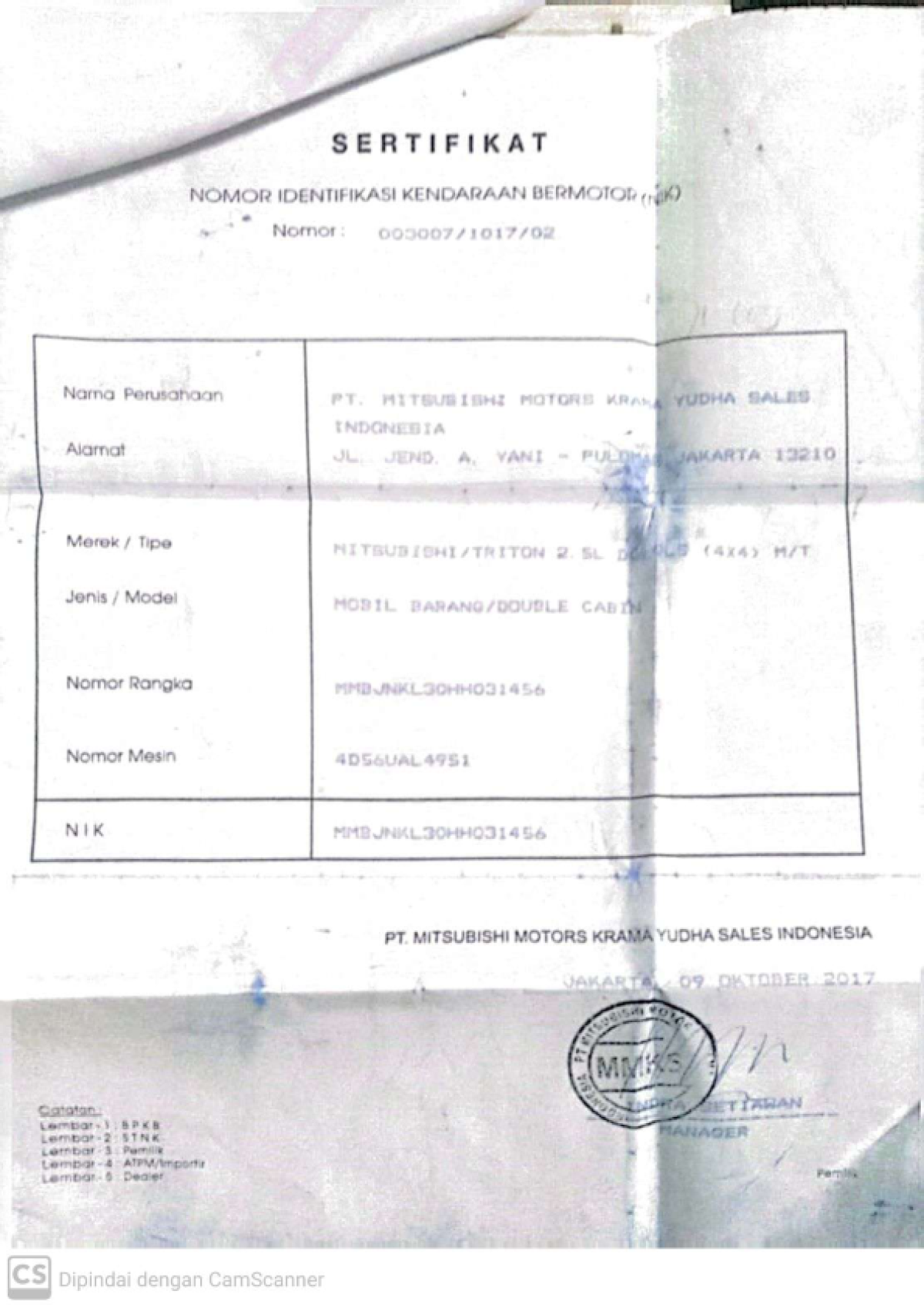 | No. Rangka | : | MMBJNKL30HH031456 |