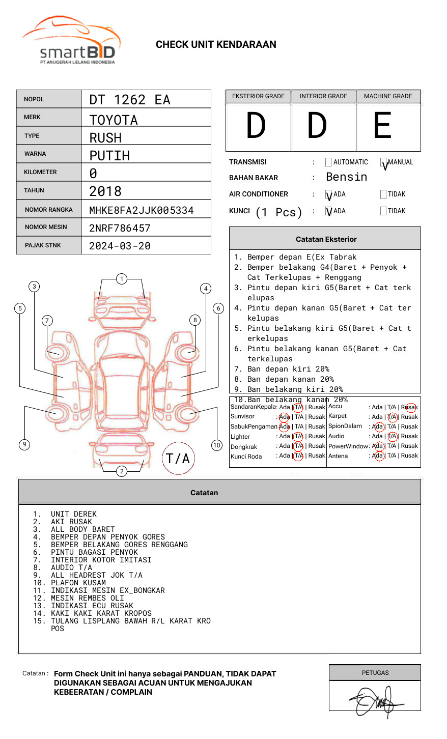 SEBELUM MELAKUKAN PENAWARAN UNIT PESERTA LELANG WAJIB MELAKUKAN PENGECEKAN UNIT DAN DOKUMEN TERLEBIH DAHULU // PIC AHMAD 082345278181 IKRAM 085241587738 // UNIT DIKENAKAN BIAYA PPN 1.1% DARI HARGA TERBENTUK //