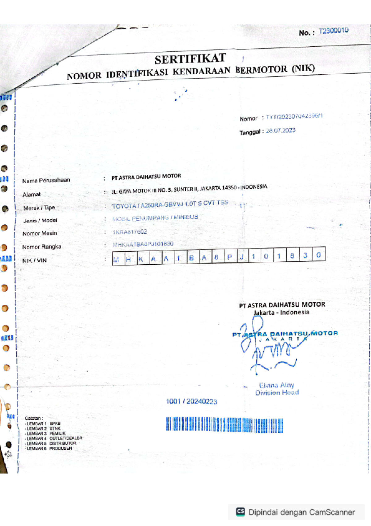 | No. Rangka | : | MHKAA1BA8PJ101830 |
