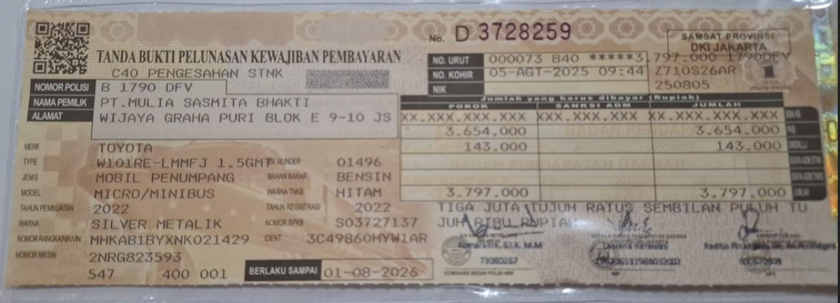 | Pajak STNK | : | 1 Agustus 2026 |
