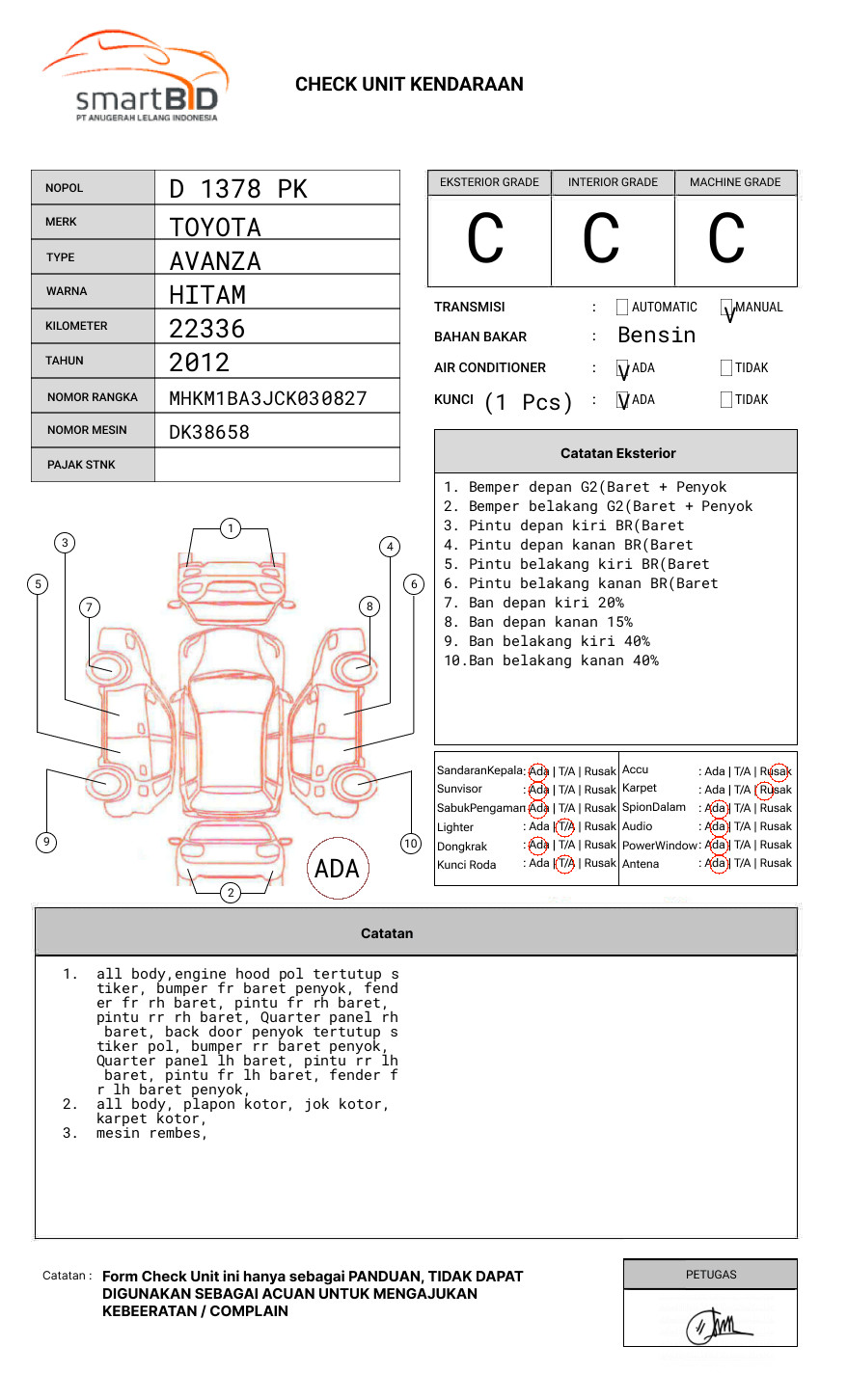 SEBELUM MELAKUKAN PENAWARAN UNIT PESERTA LELANG WAJIB MELAKUKAN PENGECEKAN UNIT DAN DOKUMEN TERLEBIH DAHULU // PIC DENNY : 0852-9442-5362 // UNIT DIKENAKAN BIAYA PPN 1.1% DARI HARGA TERBENTUK // KET E-SAMSAT "TELAH LEPAS KEPEMILIKKAN"
