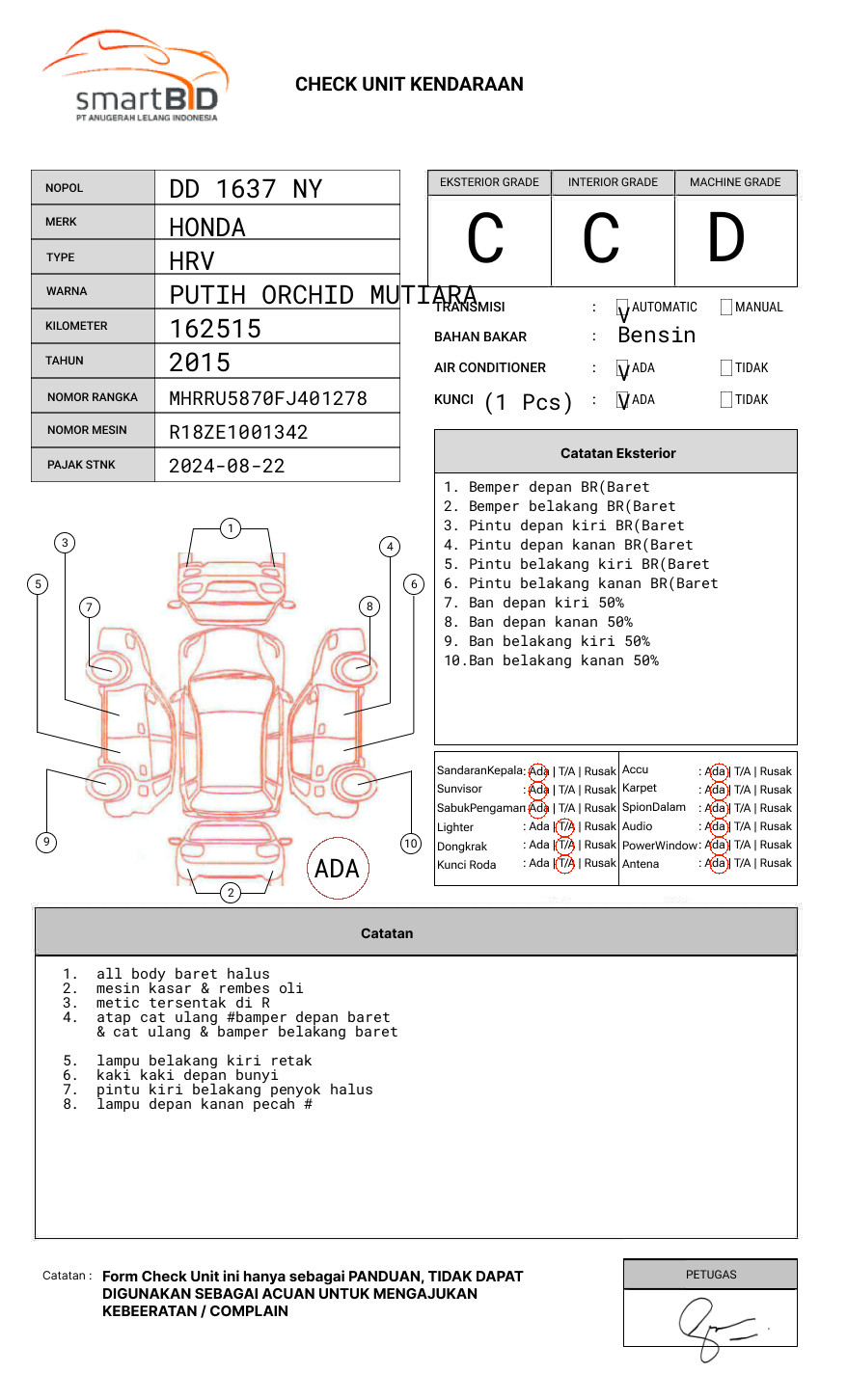 SEBELUM MELAKUKAN PENAWARAN UNIT PESERTA LELANG WAJIB MELAKUKAN PENGECEKAN UNIT DAN DOKUMEN TERLEBIH DAHULU // PIC LULU +62 856-5712-5589//UNIT DIKENAKAN BIAYA PPN 1.1% DARI HARGA TERBENTUK // NOPOL FISIK T/A