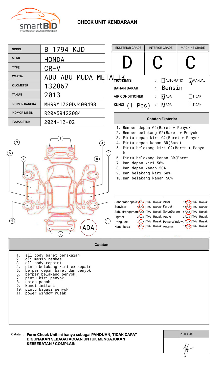SEBELUM MELAKUKAN PENAWARAN UNIT PESERTA LELANG WAJIB MELAKUKAN PENGECEKAN UNIT DAN DOKUMEN TERLEBIH DAHULU // UNIT DIKENAKAN BIAYA PPN 1.1% DARI HARGA TERBENTUK // WANDA :62 858-6767-0166