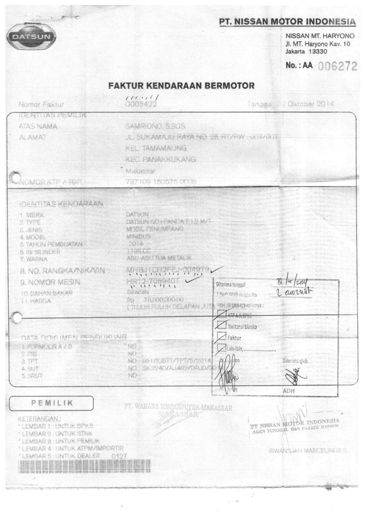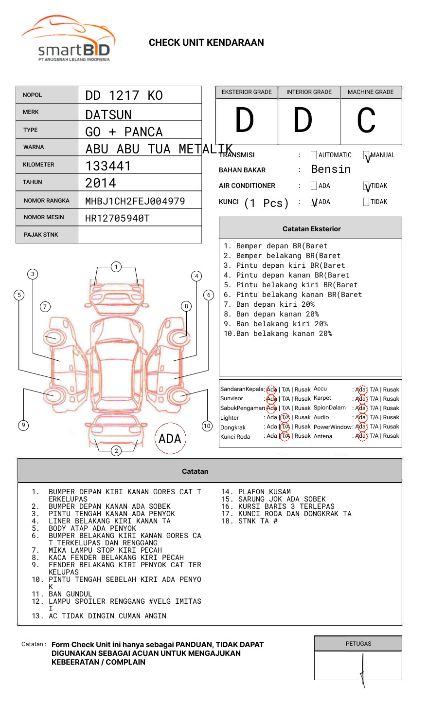 SEBELUM MELAKUKAN PENAWARAN UNIT PESERTA LELANG WAJIB MELAKUKAN PENGECEKAN UNIT DAN DOKUMEN TERLEBIH DAHULU // PIC RUDAL 0821 9140 0425 / MUHAMMAD DARWIS 082348587430 // UNIT DIKENAKAN BIAYA PPN 1.1% DARI HARGA TERBENTUK //