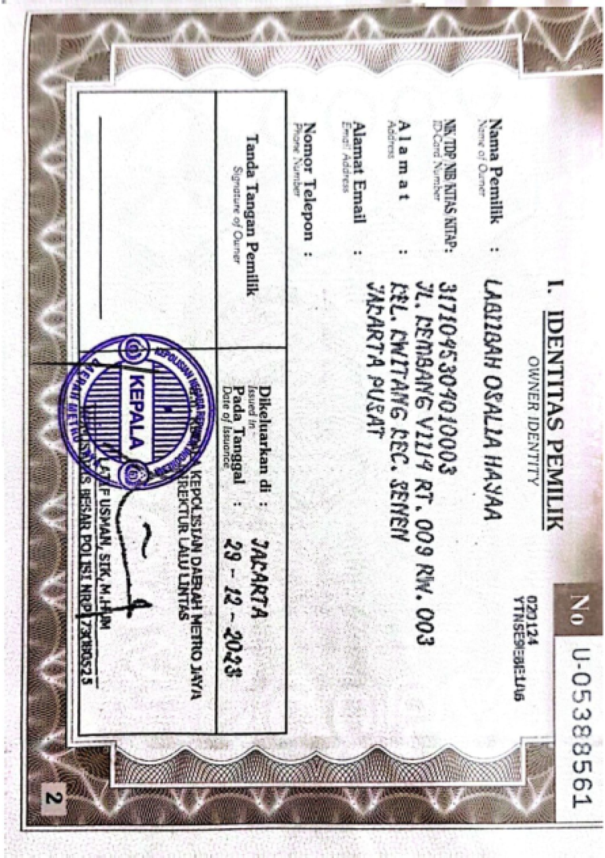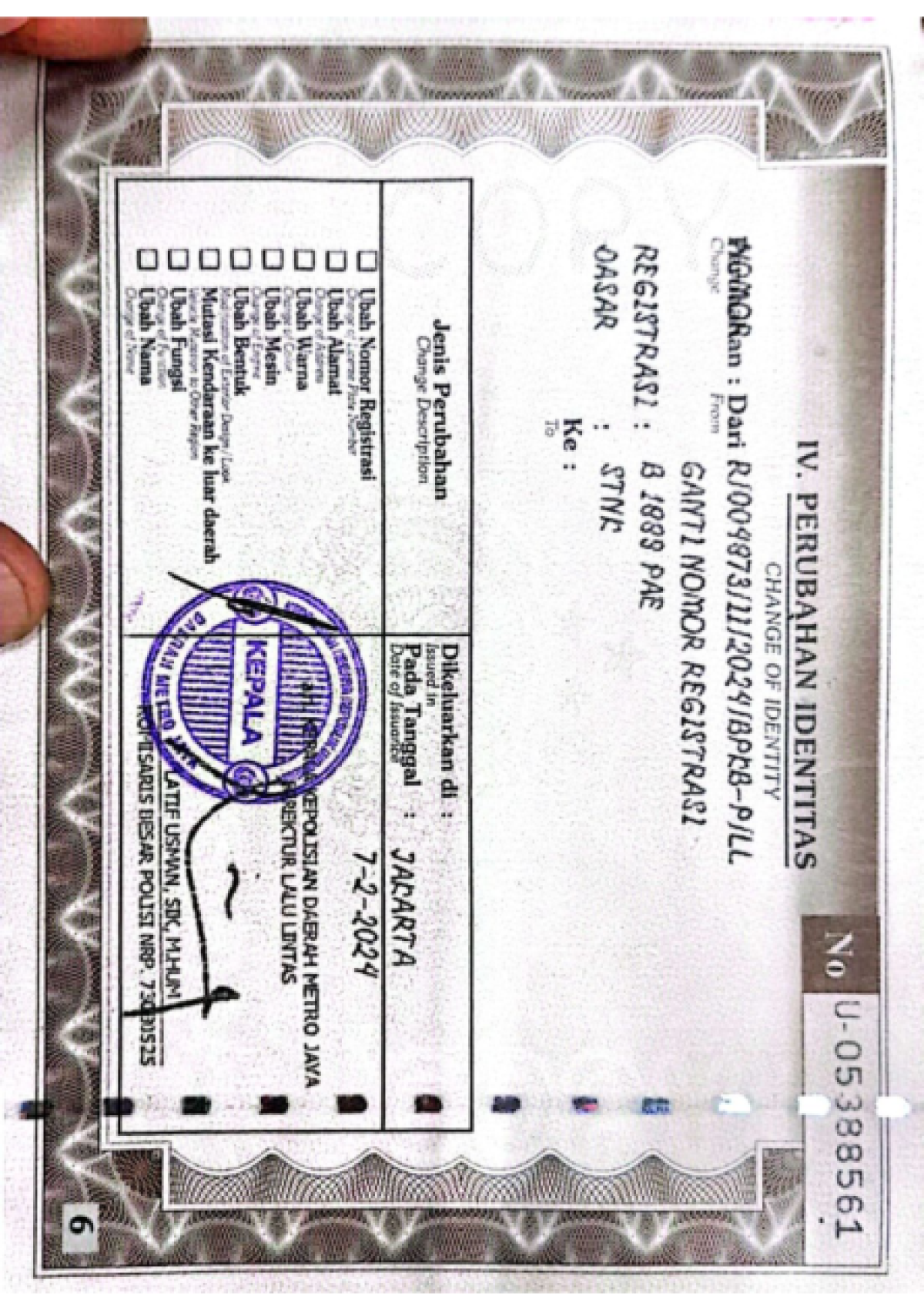 No. Polisi | : | B 1889 PAE |