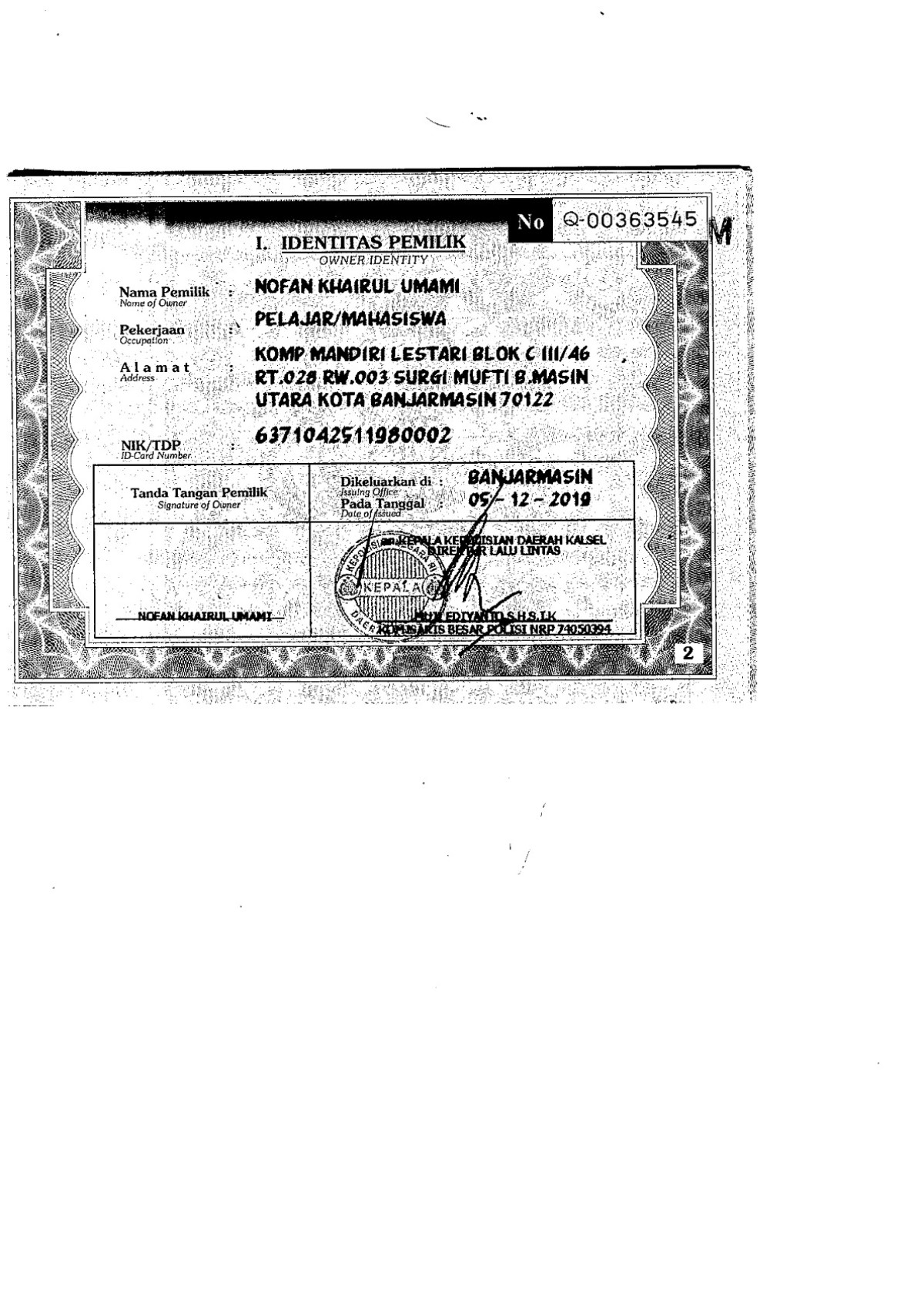 | FK. KTP | : | Tidak Ada |