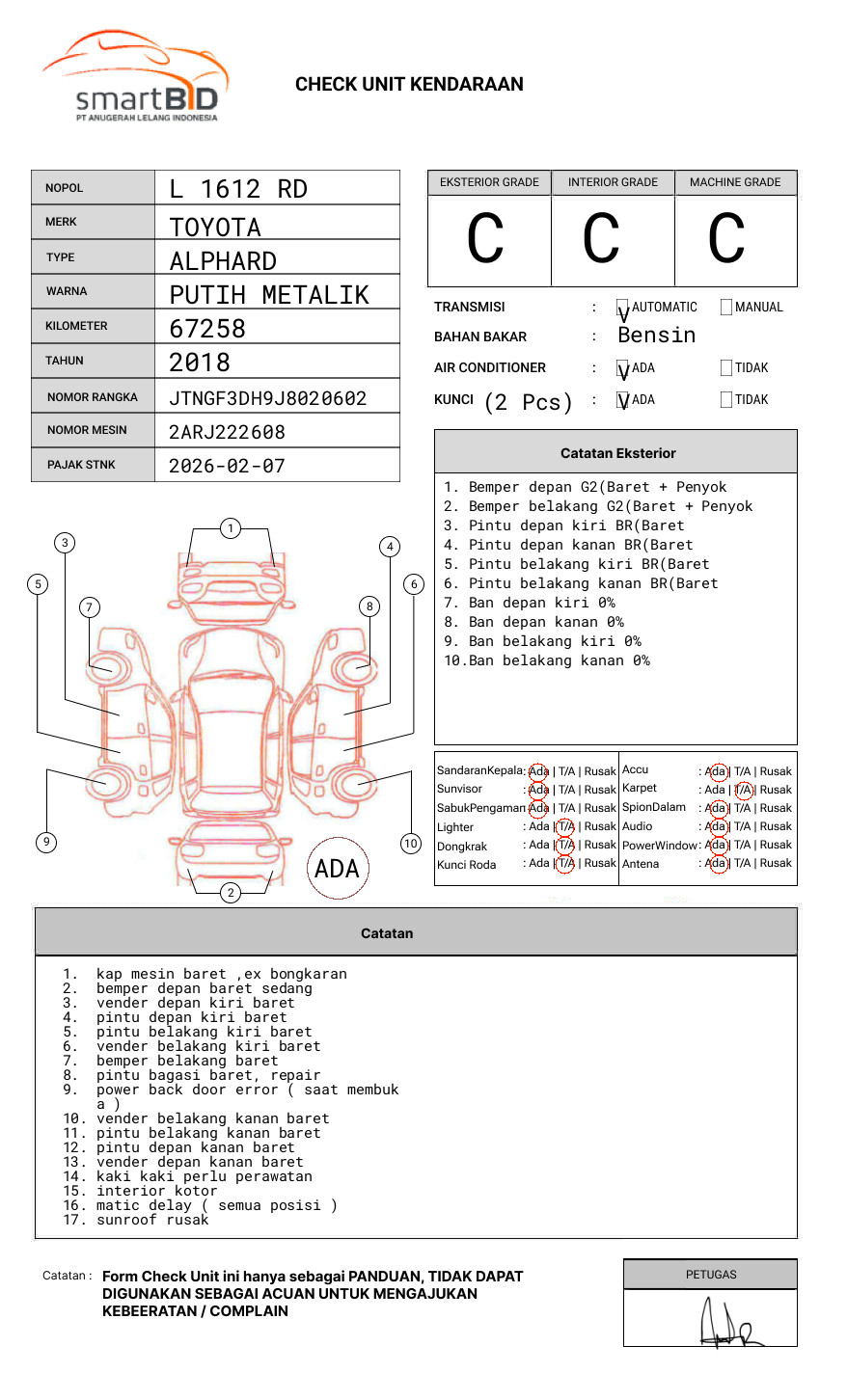SEBELUM MELAKUKAN PENAWARAN UNIT PESERTA LELANG WAJIB MELAKUKAN PENGECEKAN UNIT DAN DOKUMEN TERLEBIH DAHULU // PIC AWAL +62 895-3231-57272 / ANDRI 085136886212 // UNIT DIKENAKAN BIAYA PPN 1.1% DARI HARGA TERBENTUK