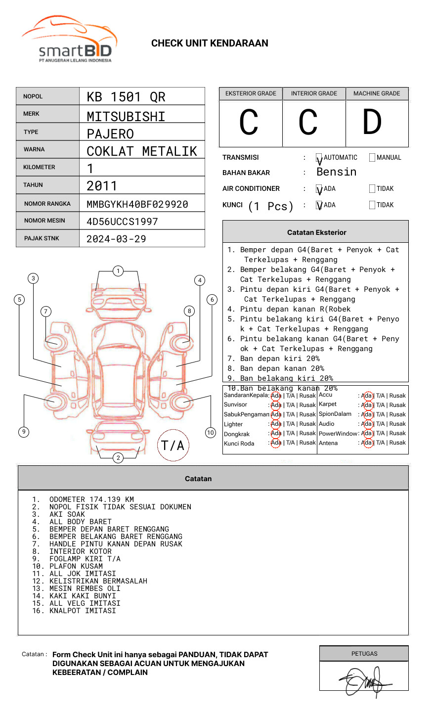 SEBELUM MELAKUKAN PENAWARAN UNIT PESERTA LELANG WAJIB MELAKUKAN PENGECEKAN UNIT DAN DOKUMEN TERLEBIH DAHULU // PIC AHMAD 082345278181 IKRAM 085241587738 // UNIT DIKENAKAN BIAYA PPN 1.1% DARI HARGA TERBENTUK //