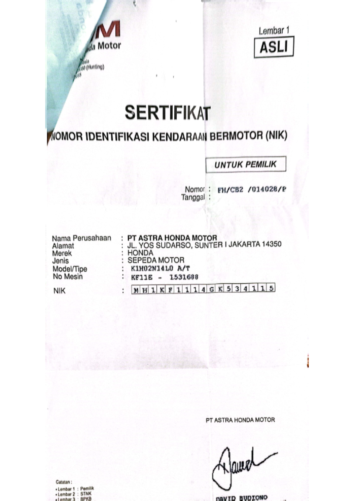 | No. Rangka | : | MH1KF1114GK534115 |