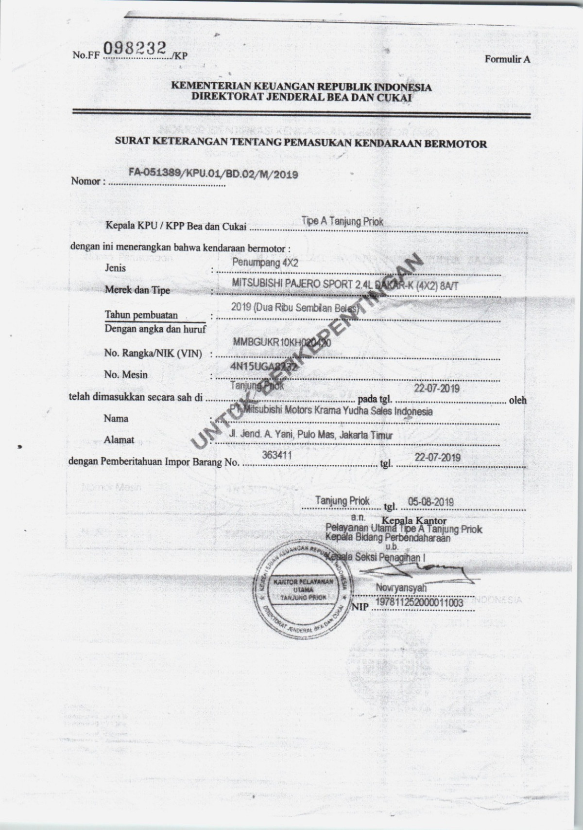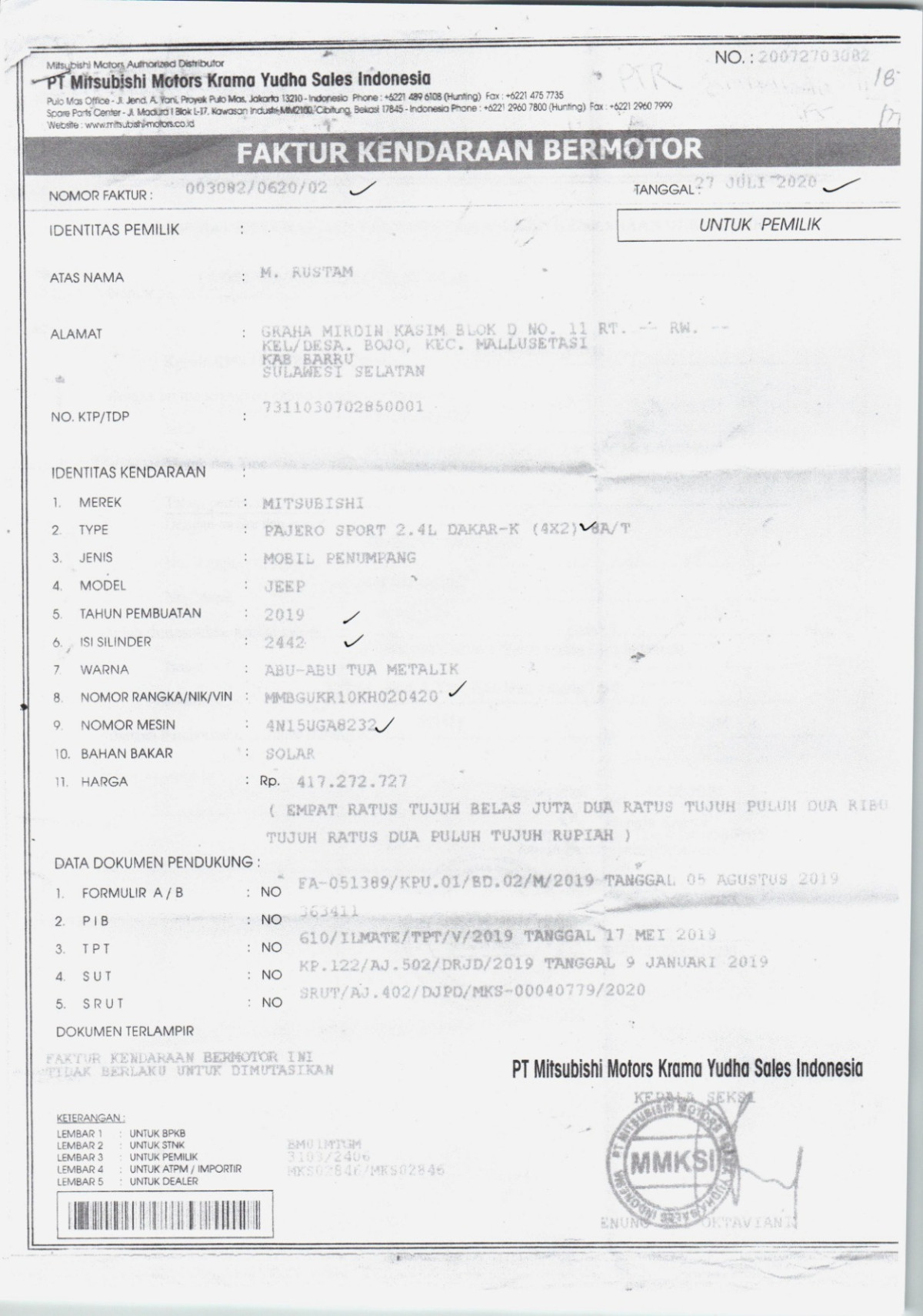 | No. Rangka | : | MMBGUKR10KH020420 |