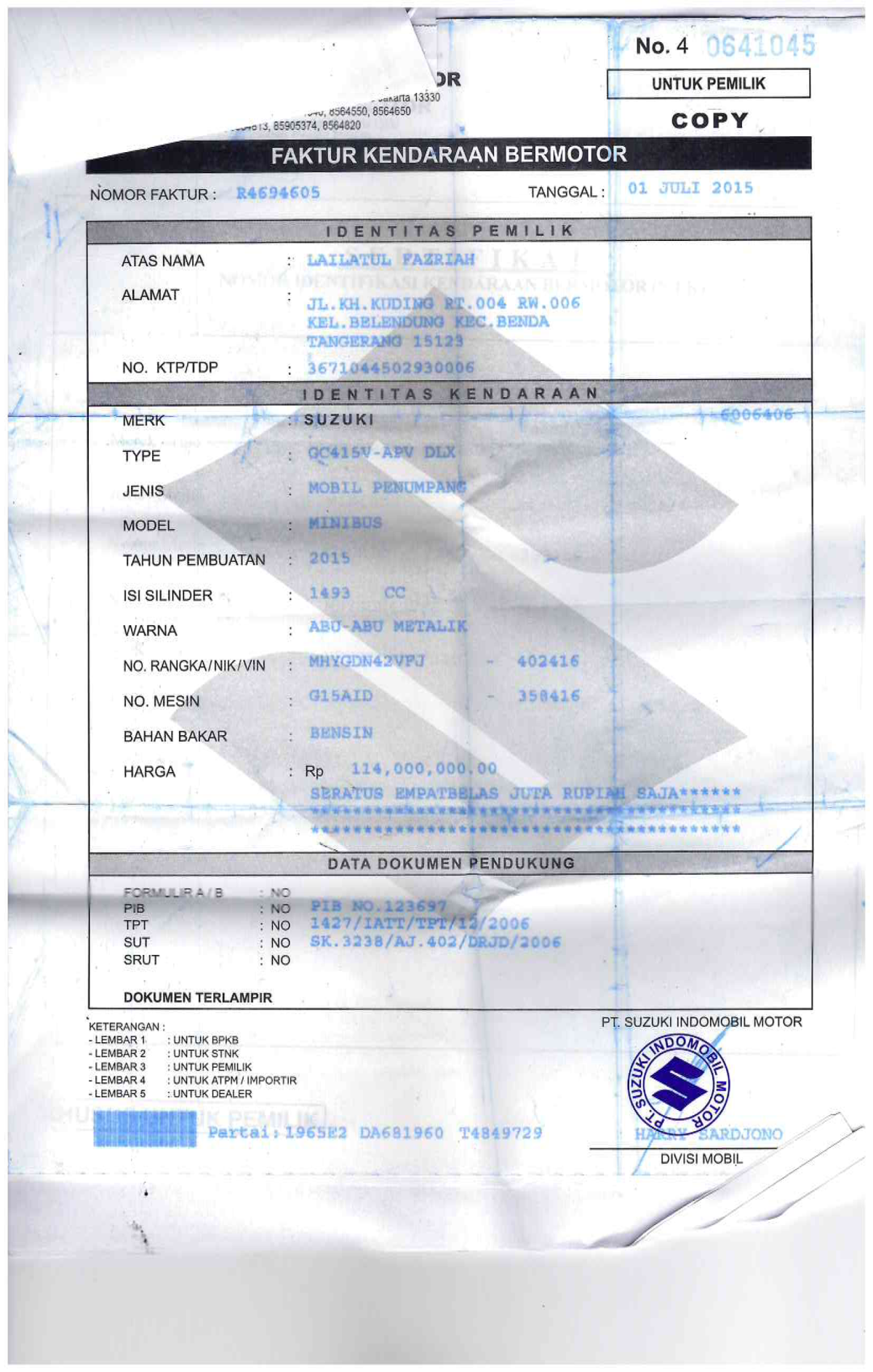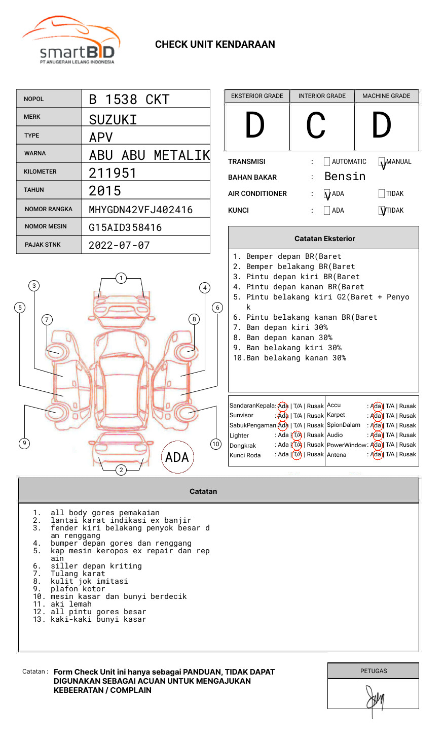 SEBELUM MELAKUKAN PENAWARAN UNIT PESERTA LELANG WAJIB MELAKUKAN PENGECEKAN UNIT DAN DOKUMEN TERLEBIH DAHULU // PIC MAS UD : 081213061687// UNIT DIKENAKAN BIAYA PPN 1.1% DARI HARGA TERBENTUK // TERDAPAT PERBEDAAN MASA BERLAKU NOTICE PAJAK DGN E-SAMSAT// PADA NOTICE PAJAK FISIK "07/07/2022" SEDANGKAN PADA E-SAMSAT "07/07/2025"