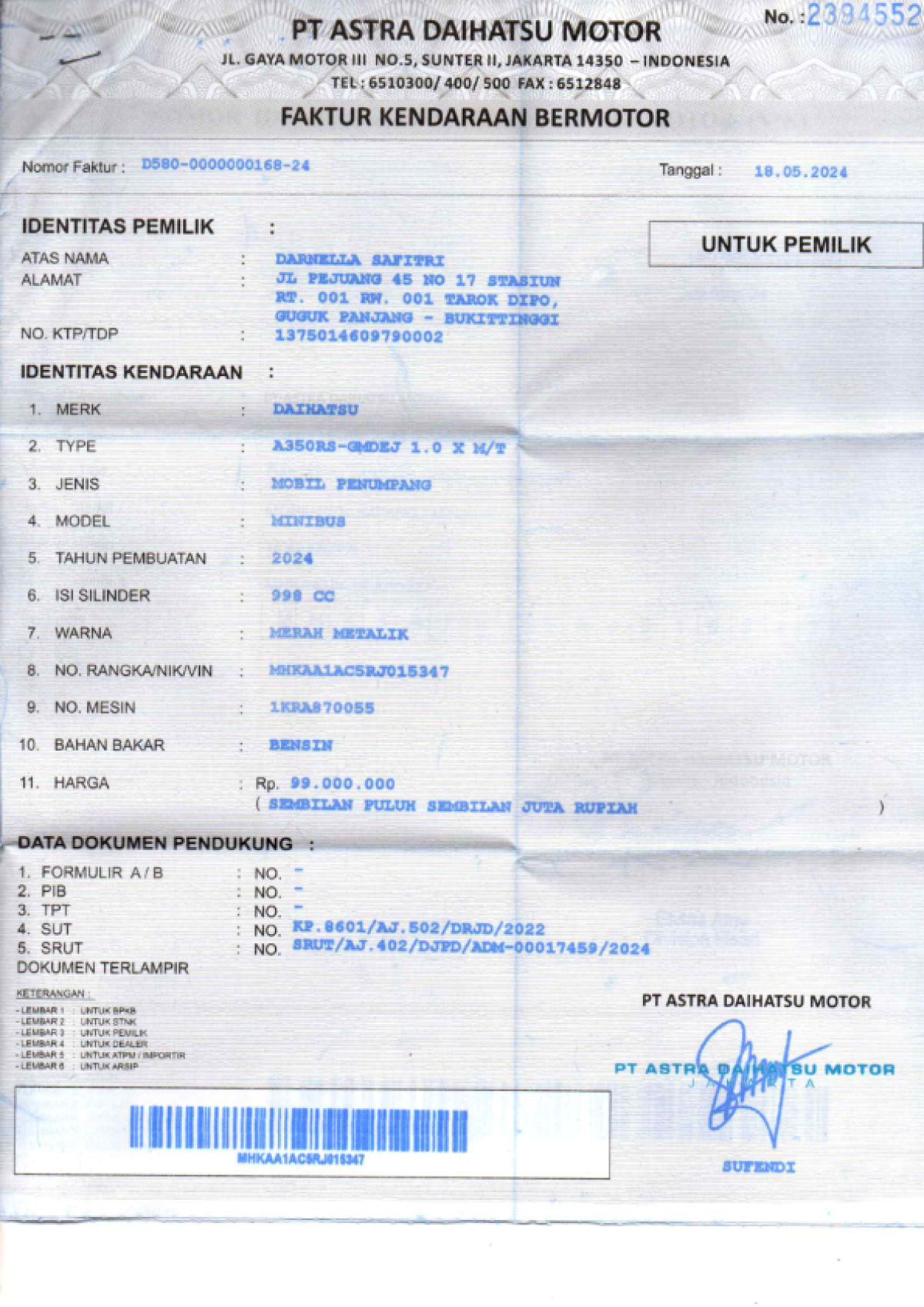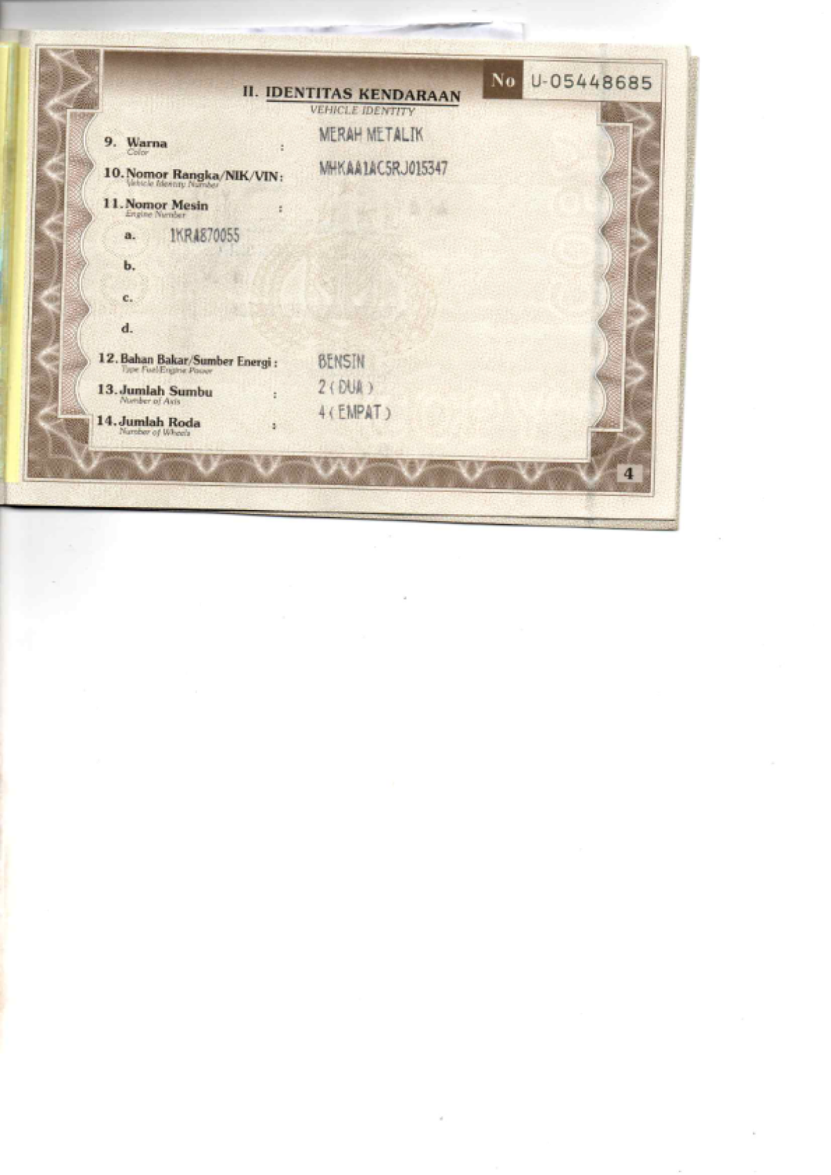 No. Rangka | : | MHKAA1AC5RJ015347 |