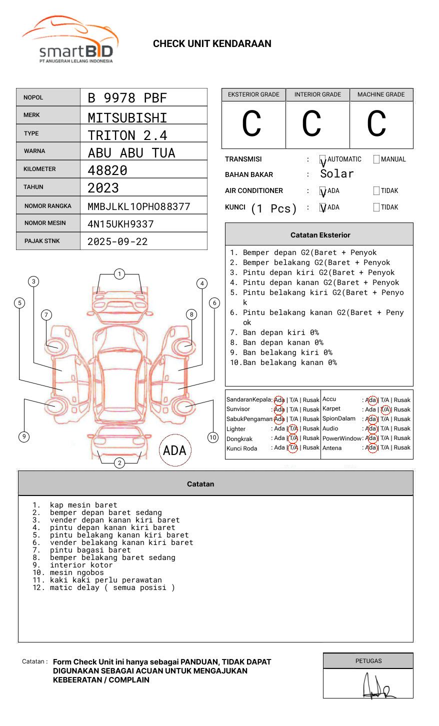 SEBELUM MELAKUKAN PENAWARAN UNIT PESERTA LELANG WAJIB MELAKUKAN PENGECEKAN UNIT DAN DOKUMEN TERLEBIH DAHULU // PEMENANG LELANG DIKENAKAN BIAYA PPN 1.1% DARI HARGA TERBENTUK // PIC AWAL +62 895-3231-57272 / ANDRI 085136886212