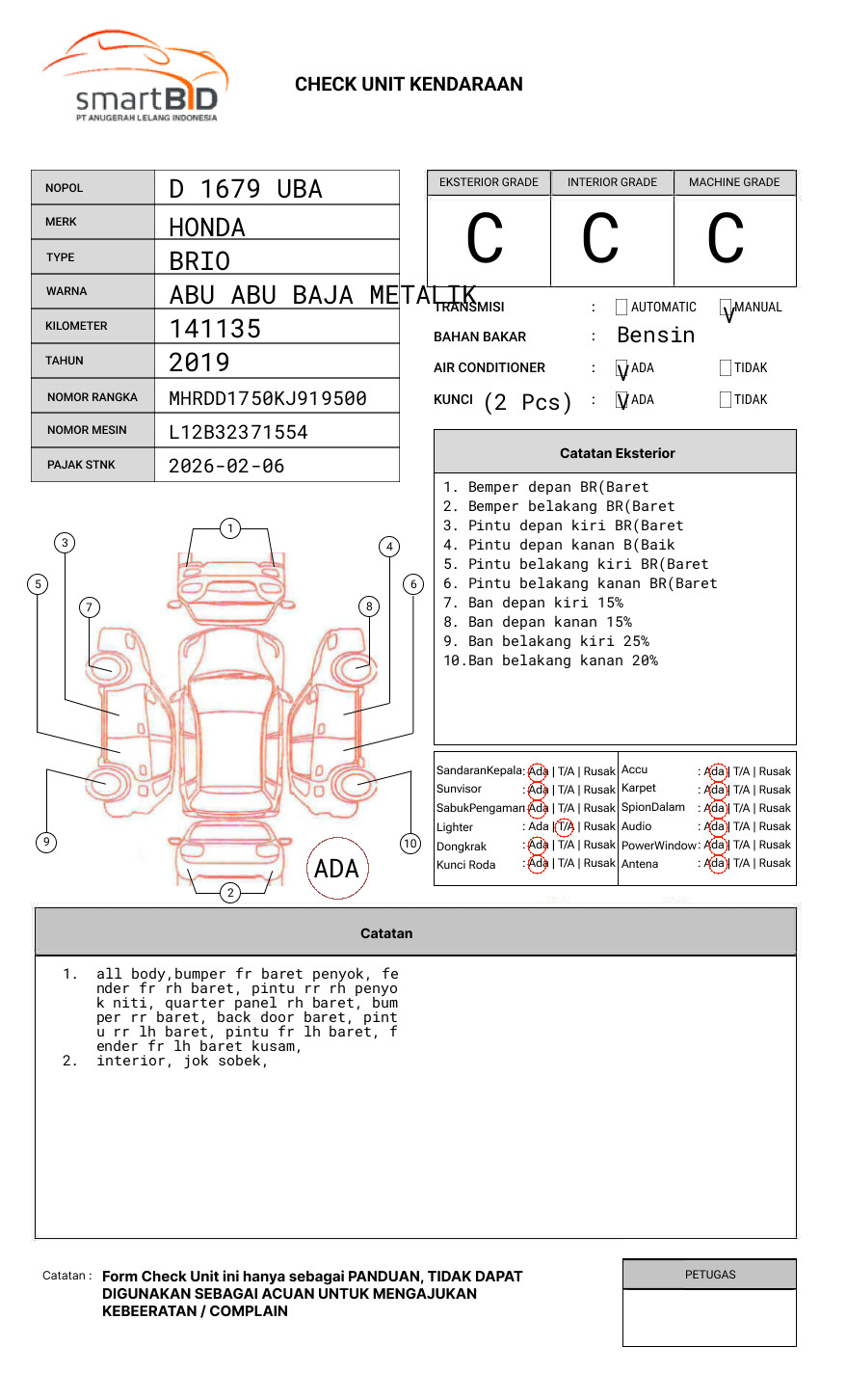 SEBELUM MELAKUKAN PENAWARAN UNIT PESERTA LELANG WAJIB MELAKUKAN PENGECEKAN UNIT DAN DOKUMEN TERLEBIH DAHULU // PIC DENNY : 0852-9442-5362 // UNIT DIKENAKAN BIAYA PPN 1.1% DARI HARGA TERBENTUK //