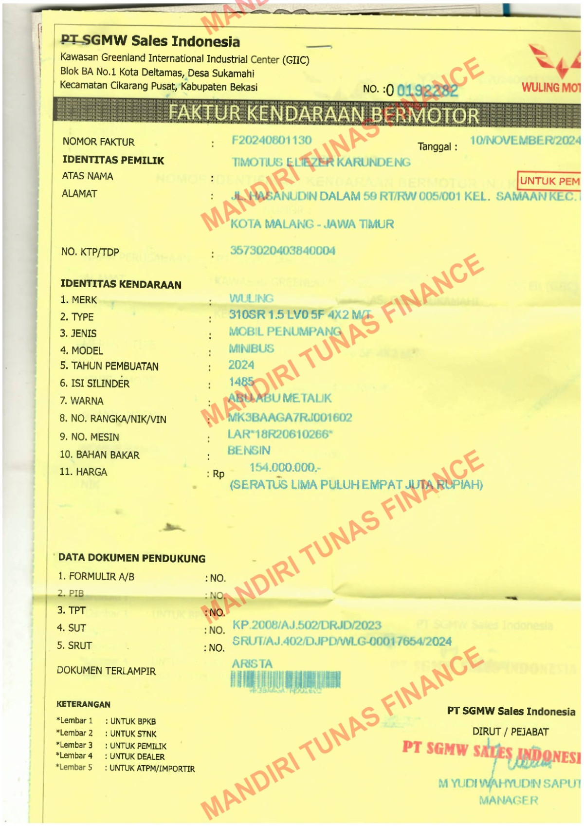 No. Rangka | : | MK3BAAGA7RJ001602 |