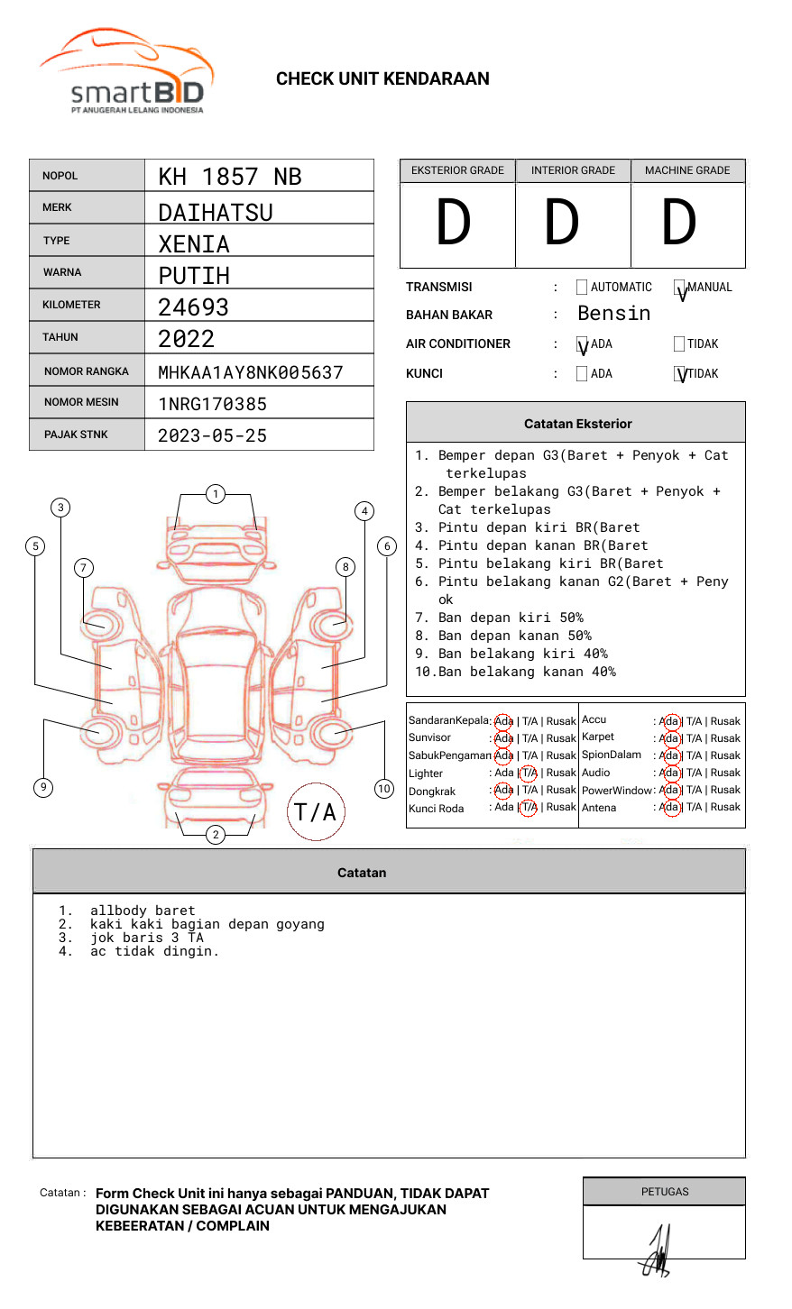 SEBELUM MELAKUKAN PENAWARAN UNIT PESERTA LELANG WAJIB MELAKUKAN PENGECEKAN UNIT DAN DOKUMEN TERLEBIH DAHULU // JHOE +62 878-6315-2679 / RIDHO 0899-1384-240 // UNIT DIKENAKAN BIAYA PPN 1.1% DARI HARGA TERBENTUK //