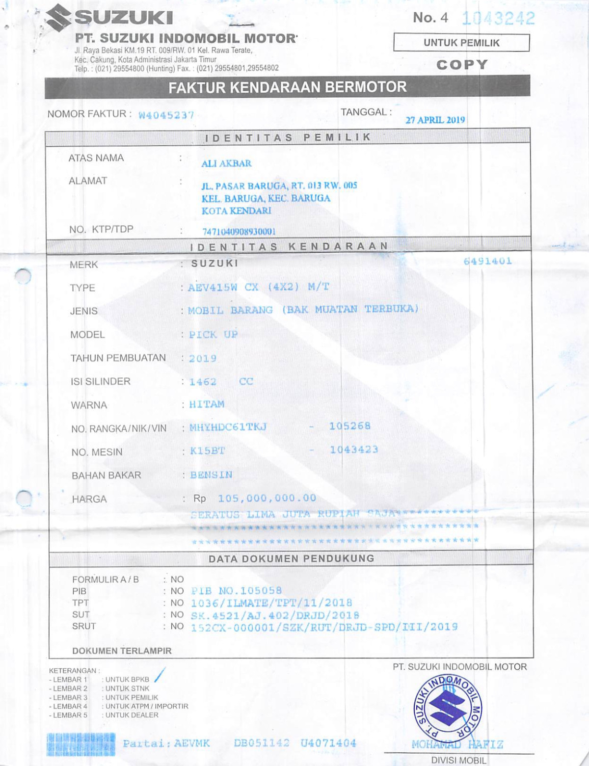 No. Rangka | : | MHYHDC61TKJ105268 |