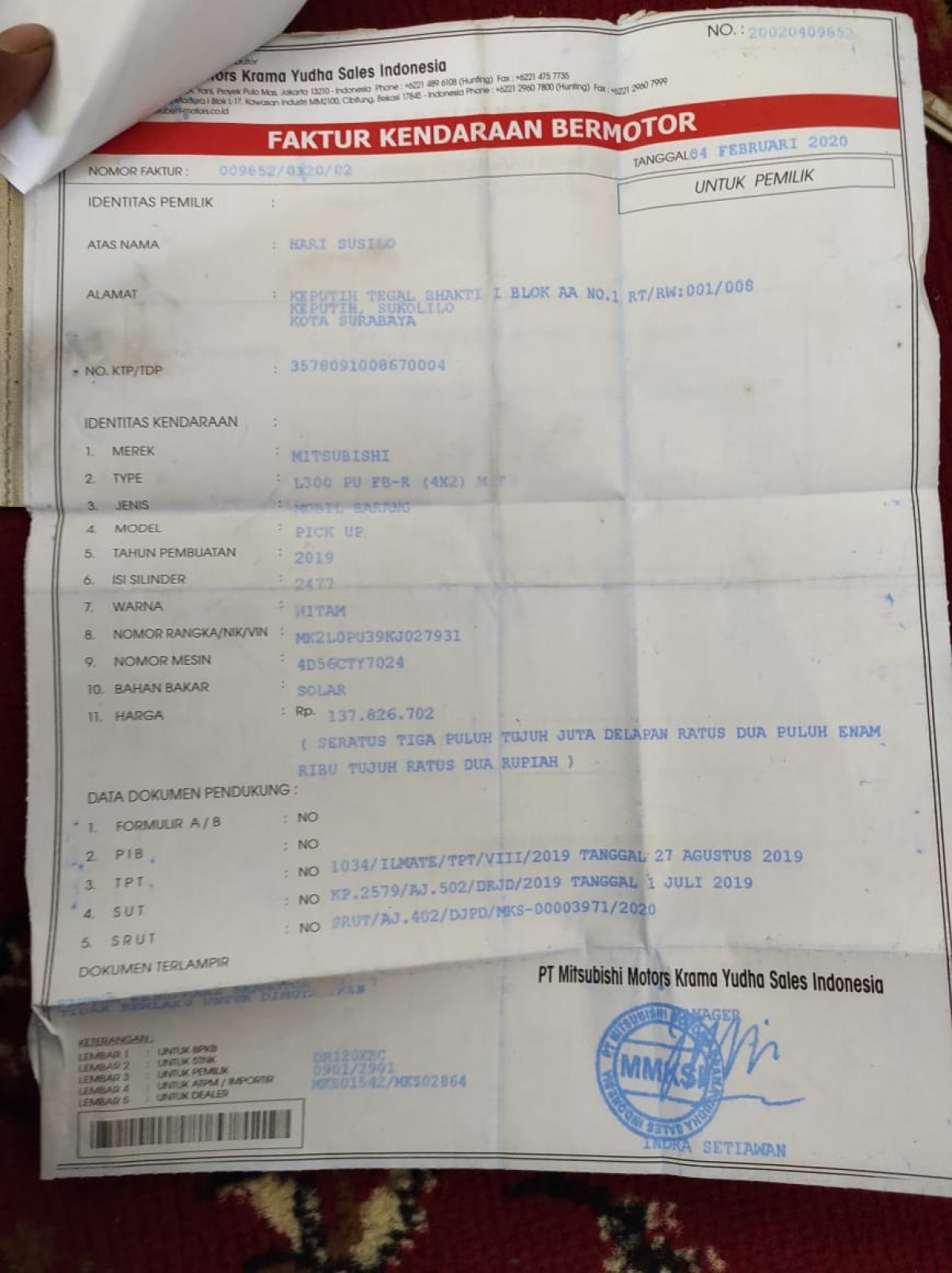 No. Rangka | : | MK2L0PU39KJ027931 |