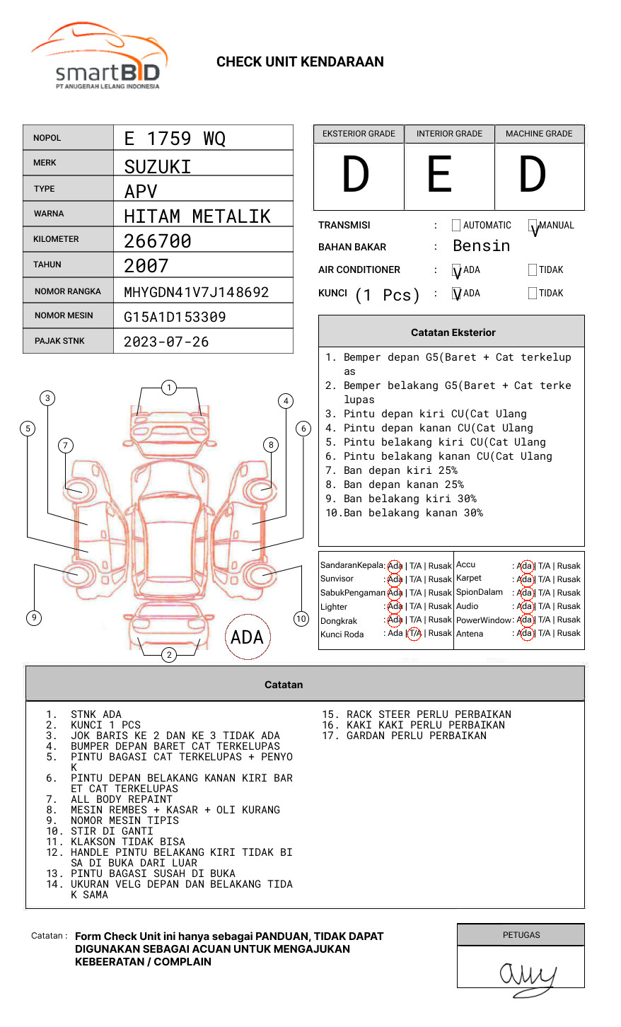 SEBELUM MELAKUKAN PENAWARAN UNIT PESERTA LELANG WAJIB MELAKUKAN PENGECEKAN UNIT DAN DOKUMEN TERLEBIH DAHULU // PIC ARDIAZ 082142028080 // UNIT DIKENAKAN BIAYA PPN 1.1% DARI HARGA TERBENTUK // NOMOR MESIN TIPIS TIDAK TERBACA // ADA PERBEDAAN NOPOL PADA FISIK N1996BO PADA DOKUMEN E1759WQ