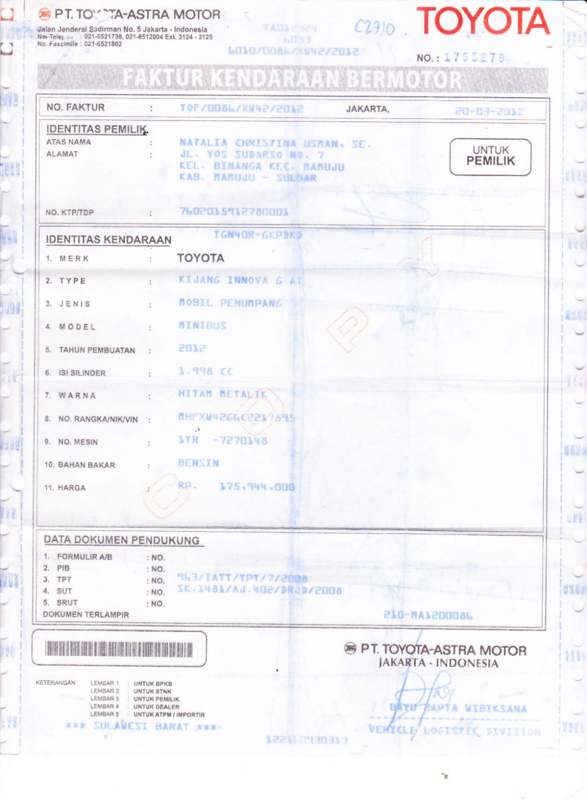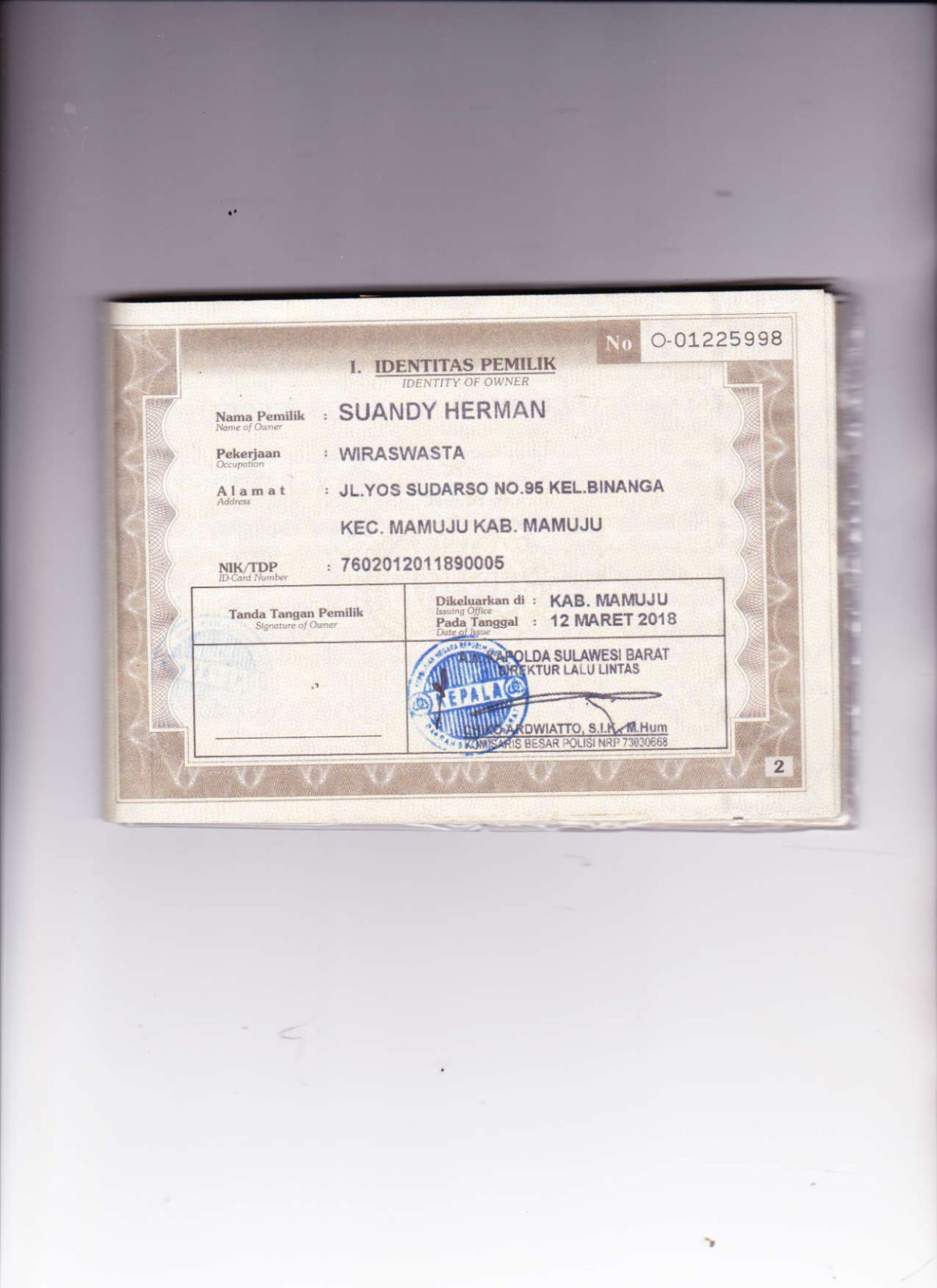 NOPOL PADA FISIK T/A // UNIT TIDAK DILAKUKAN PENGECEKAN OLEH TIM SMARTBID// SEBELUM MELAKUKAN PENAWARAN HARAP CEK KONDISI UNIT DAN DOKUMEN TERLEBIH DAHULU// WAJIB MENGHUBUNGI PIC DAN DATANG KE LOKASI UNTUK PENGECEKAN UNIT// UNIT DILELANG APA ADANYA PERMASALAHAN YANG TIMBUL DILUAR TANGGUNG JAWAB SMARTBID// PENGAMBILAN UNIT SLIDE H+2 DARI PELUNASAN // JIKA INGIN MENGAMBIL UNIT HARAP UNTUK KONFIRMASI DAHULU KE SMARTBID // JIKA YANG MENGAMBIL BIDDER HARAP MEMBAWA KTP ASLI // JIKA PENGAMBILAN DIWAKILKAN WAJIB MEMBAWA SURAT KUASA ASLI // UNIT DIKENAKAN BIAYA PPN 1,1% DARI HARGA TERBENTUK// HUBUNGI PIC NASMI 0813-4538-2856 / HUB CS PUSAT 0811119678