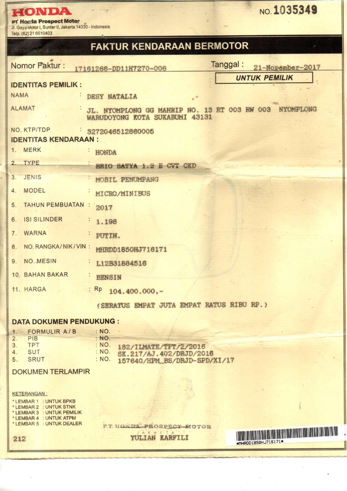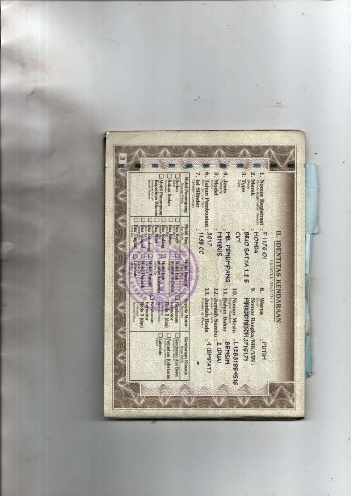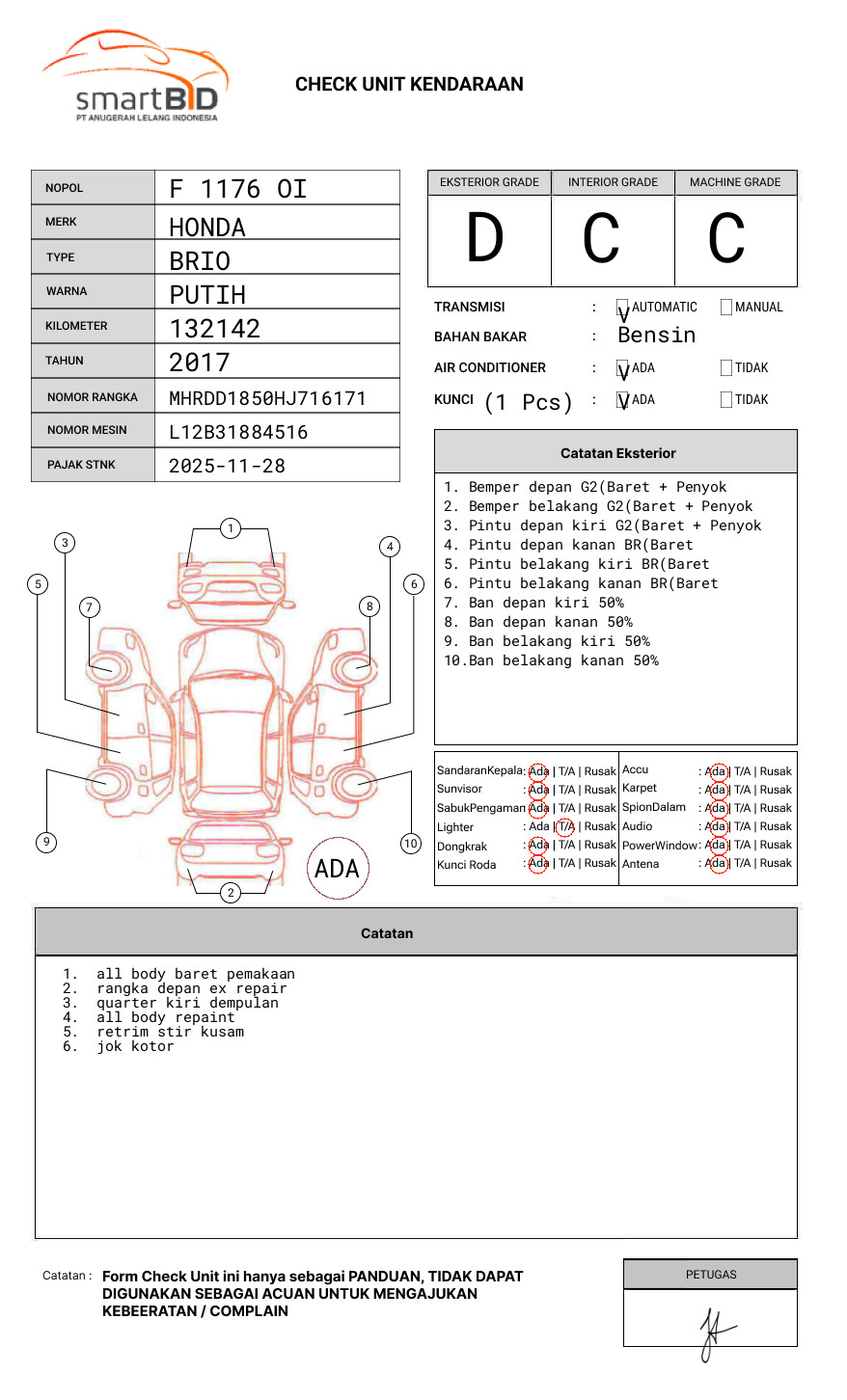SEBELUM MELAKUKAN PENAWARAN UNIT PESERTA LELANG WAJIB MELAKUKAN PENGECEKAN UNIT DAN DOKUMEN TERLEBIH DAHULU //WANDA :62 858-6767-0166 // UNIT DIKENAKAN BIAYA PPN 1.1% DARI HARGA TERBENTUK // ADA PERBEDAAN NOPOL FISIK DAN DOKUMEN BPKB//NOPOL FISIK (F 1176 OI), NOPOL BPKB (F 1178 OI)//INDIKASI BBN GANTUNG//LEMBAR PERUBAPAHAN IDENTITAS BPKB TA//