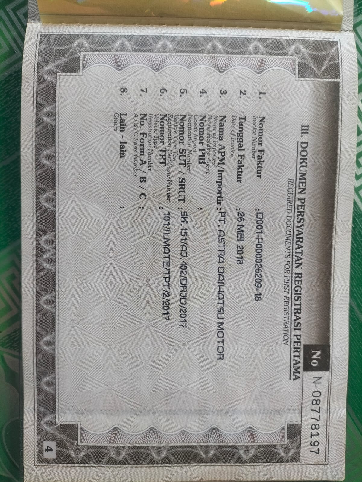 No. Rangka | : | MHKS4GA4JJJ002362 |
