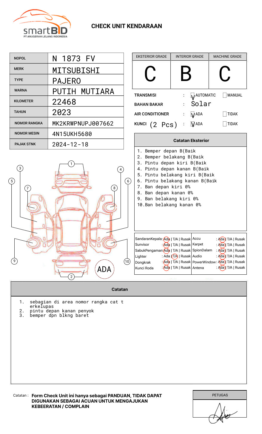 SEBELUM MELAKUKAN PENAWARAN UNIT PESERTA LELANG WAJIB MELAKUKAN PENGECEKAN UNIT DAN DOKUMEN TERLEBIH DAHULU // PIC TOYIB +62 813-3202-4730 // UNIT DIKENAKAN BIAYA PPN 1.1% DARI HARGA TERBENTUK // ADA BIAYA ROYA FIDUSIA 100.000