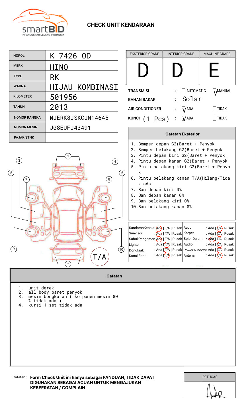 SEBELUM MELAKUKAN PENAWARAN UNIT PESERTA LELANG WAJIB MELAKUKAN PENGECEKAN UNIT DAN DOKUMEN TERLEBIH DAHULU // PIC AWAL +62 895-3231-57272 / ANDRI 085136886212 // UNIT DIKENAKAN BIAYA PPN 1.1% DARI HARGA TERBENTUK // ADA PERBEDAAN WARNA PADA FISIK ABU-ABU PADA DOKUMEN HIJAU KOMBINASI // TIDAK ADA KETERANGAN RUBAH WARNA PDA BPKB //