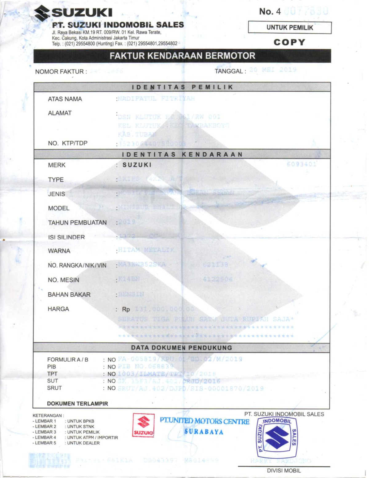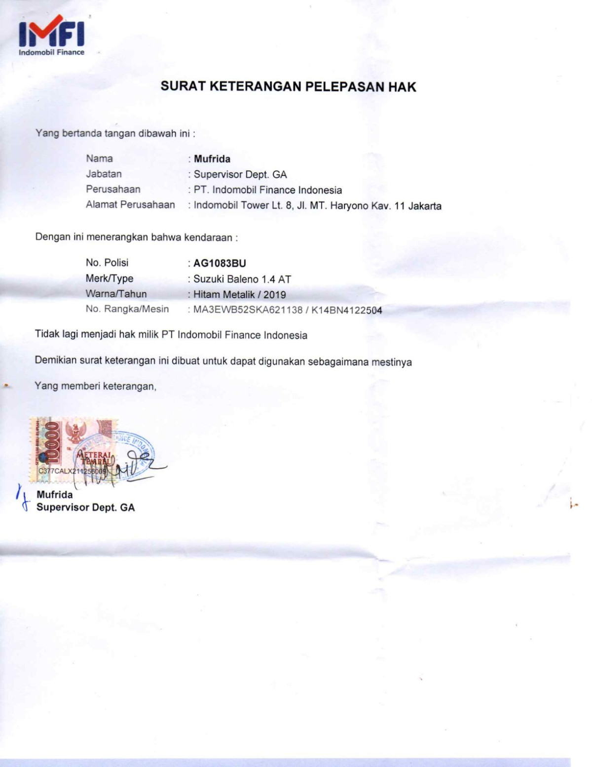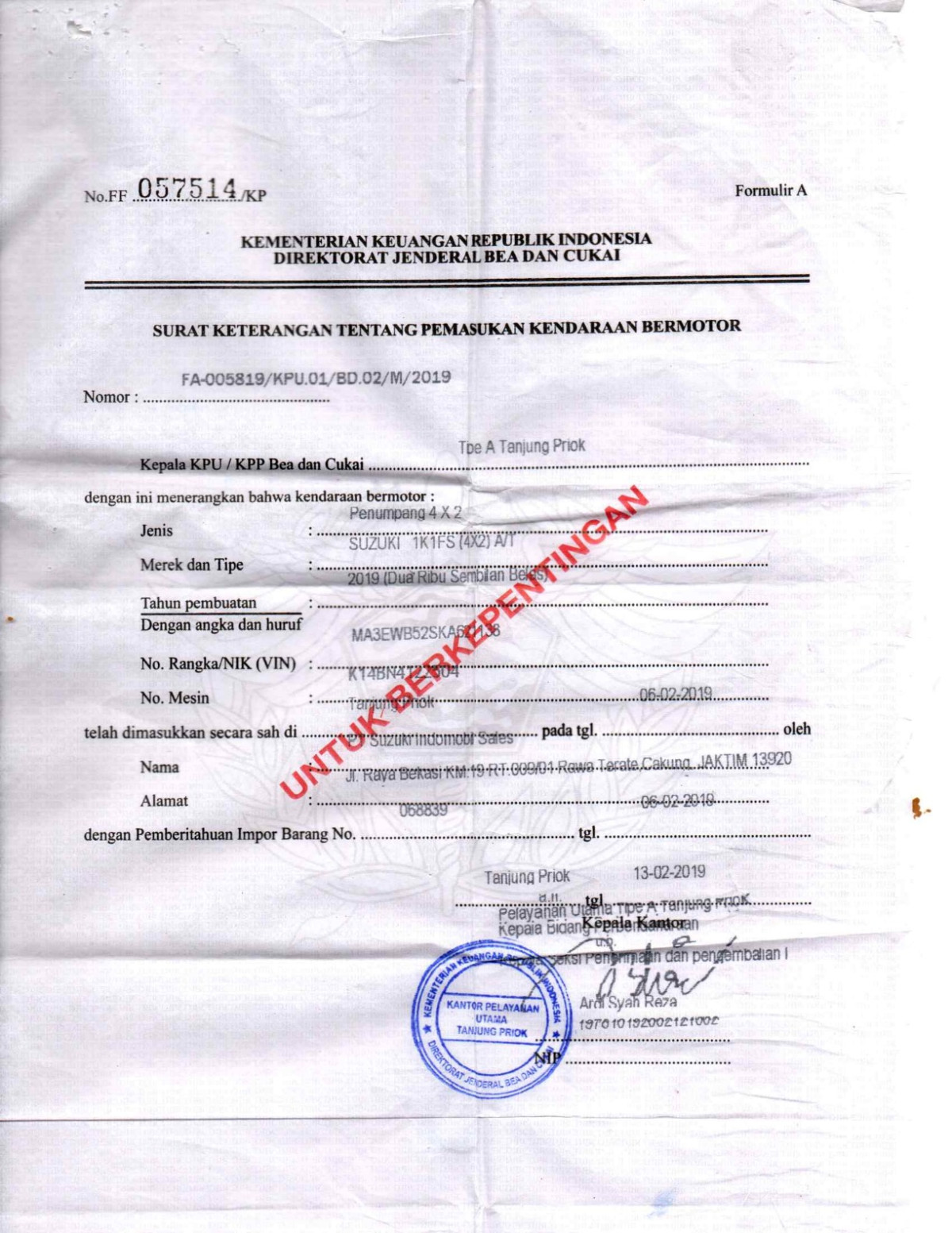 UNIT TIDAK DILAKUKAN PENGECEKAN OLEH TIM SMARTBID// SEBELUM MELAKUKAN PENAWARAN HARAP CEK KONDISI UNIT DAN DOKUMEN TERLEBIH DAHULU// WAJIB MENGHUBUNGI PIC DAN DATANG KE LOKASI UNTUK PENGECEKAN UNIT// UNIT DILELANG APA ADANYA PERMASALAHAN YANG TIMBUL DILUAR TANGGUNG JAWAB SMARTBID// PENGAMBILAN UNIT SLIDE H+2 DARI PELUNASAN // JIKA INGIN MENGAMBIL UNIT HARAP UNTUK KONFIRMASI DAHULU KE SMARTBID // JIKA YANG MENGAMBIL BIDDER HARAP MEMBAWA KTP ASLI // JIKA PENGAMBILAN DIWAKILKAN WAJIB MEMBAWA SURAT KUASA ASLI // UNIT DIKENAKAN BIAYA PPN 1,1% DARI HARGA TERBENTUK// HUBUNGI PIC SUCI VITRIANTI 0813-1206-0454 / HUB CS PUSAT 0811119678
