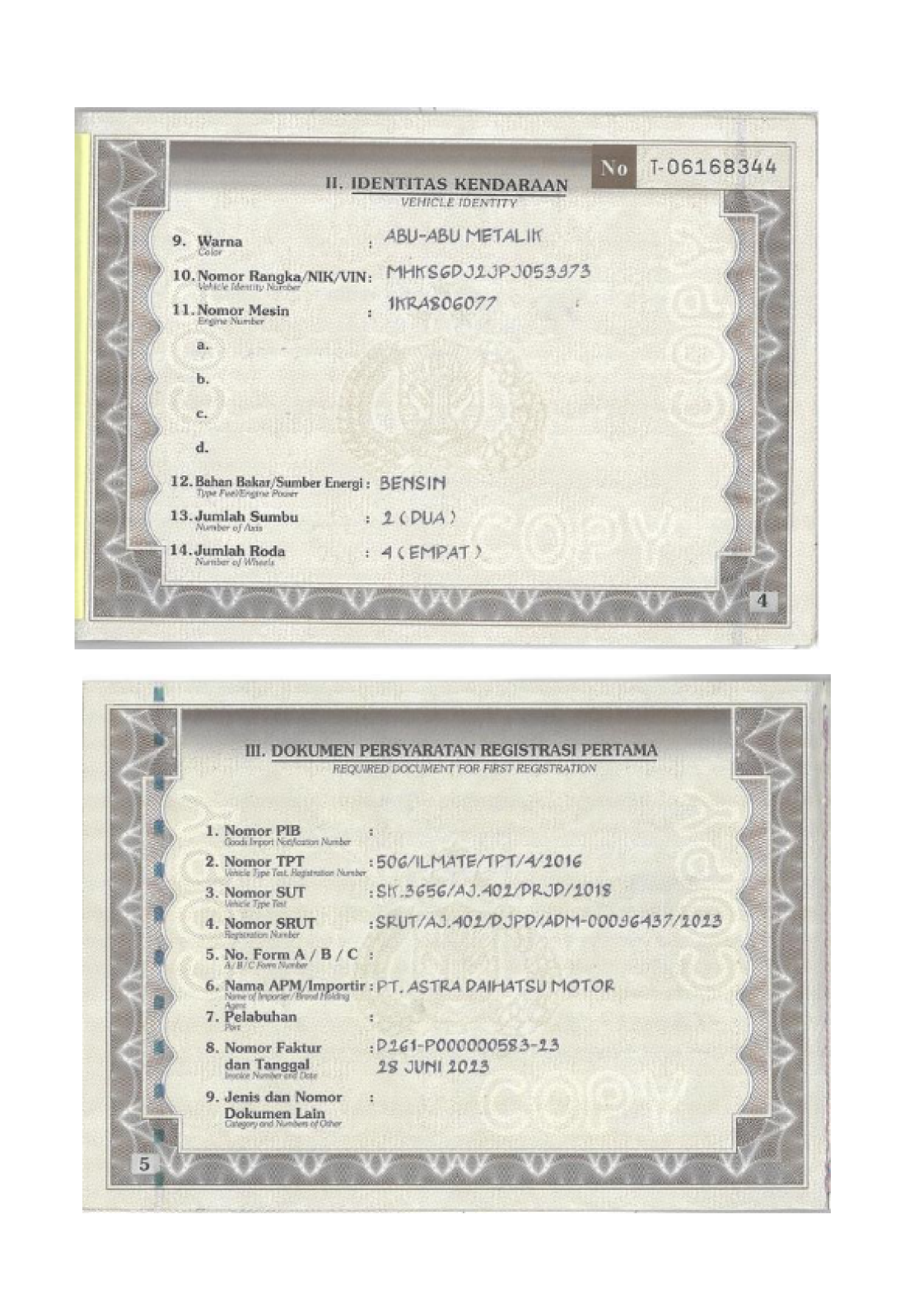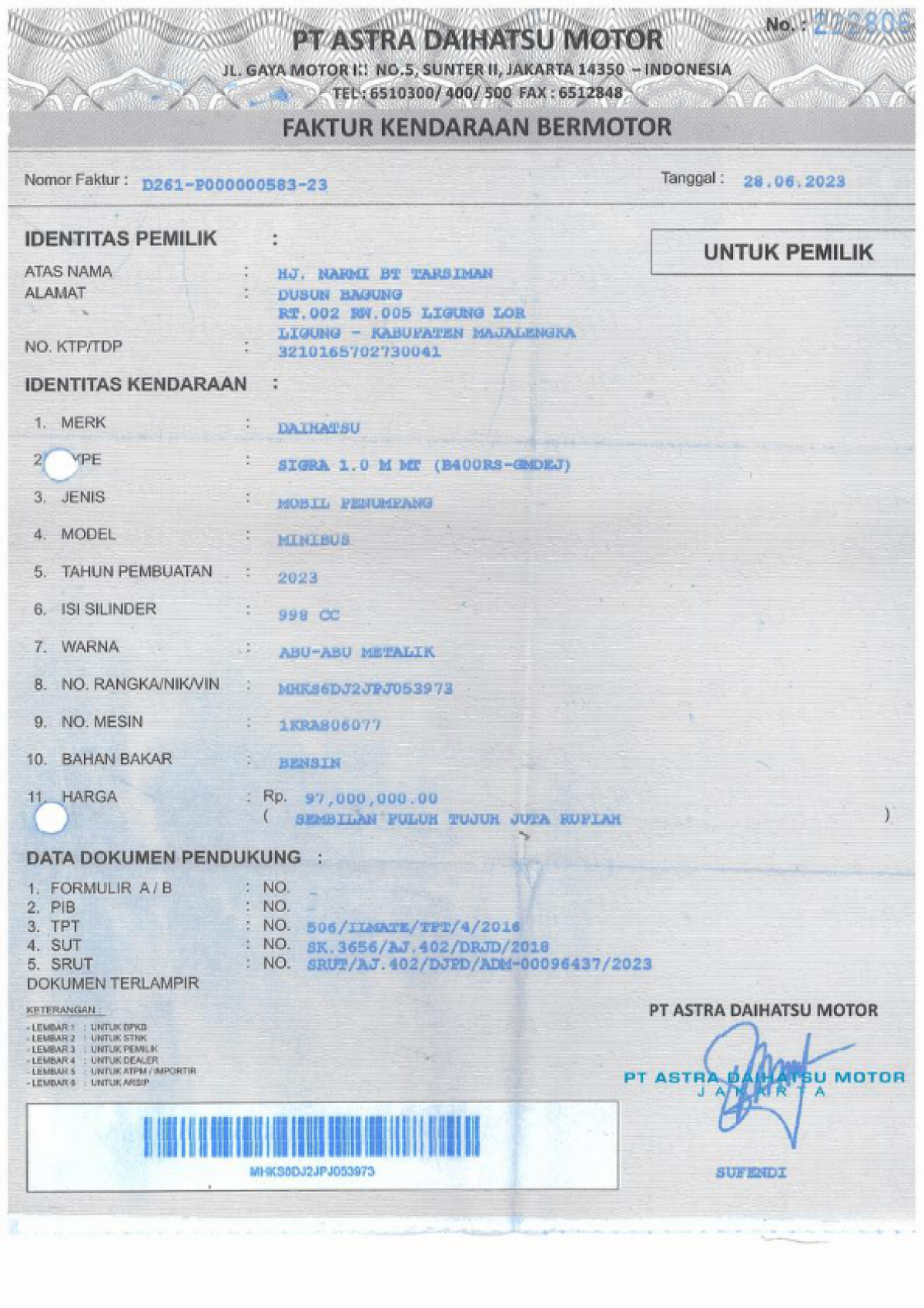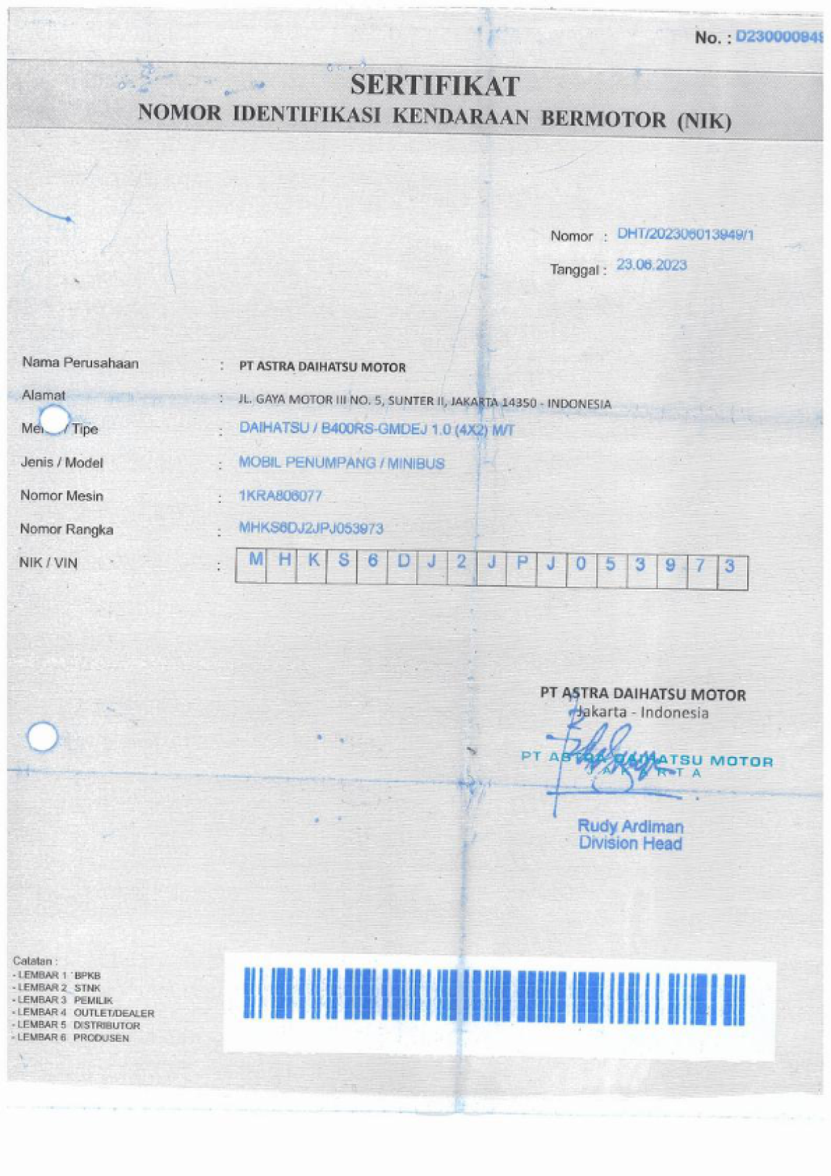 No. Rangka | : | MHKS6DJ2JPJ053973 |