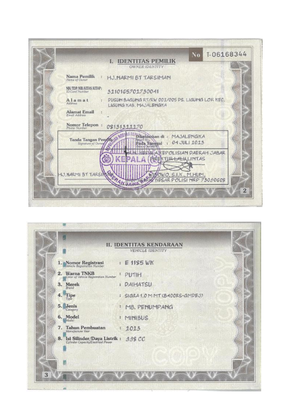 No. Polisi | : | E 1185 WK |