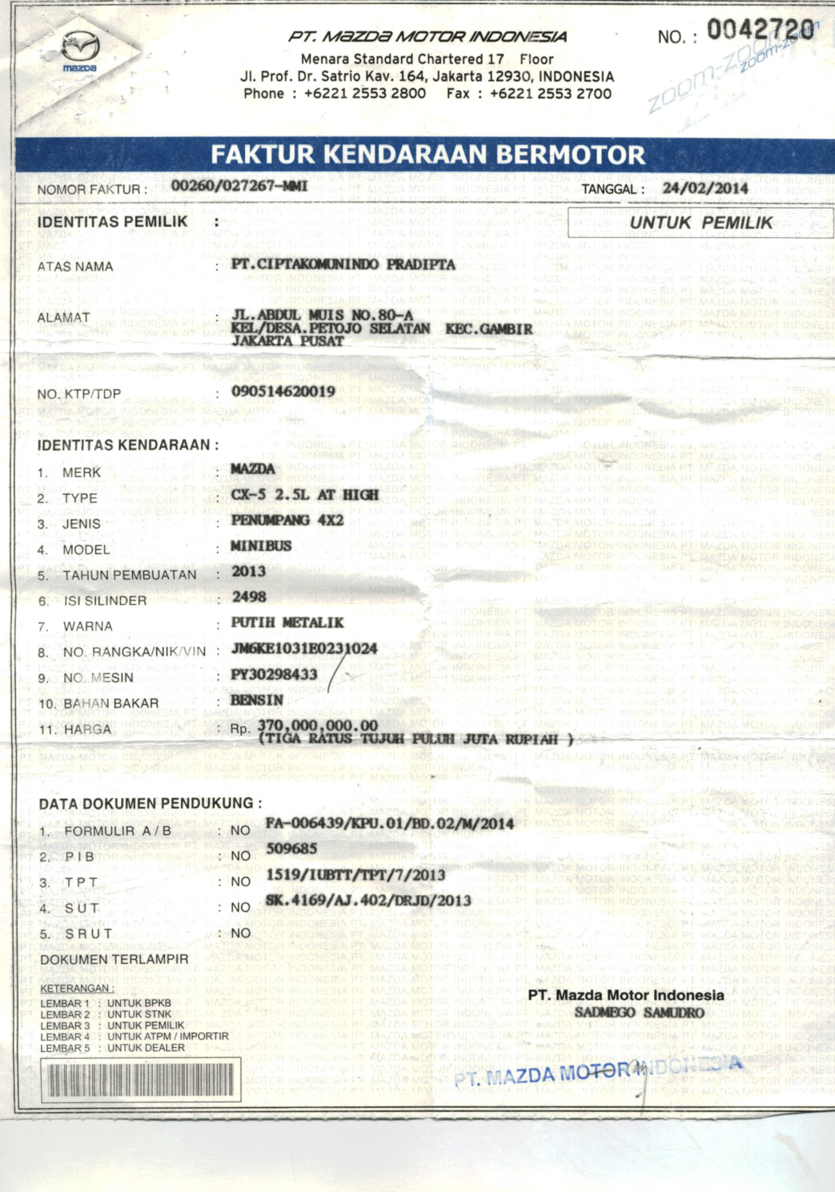 No. Rangka | : | JM6KE1031E031E0231024 |