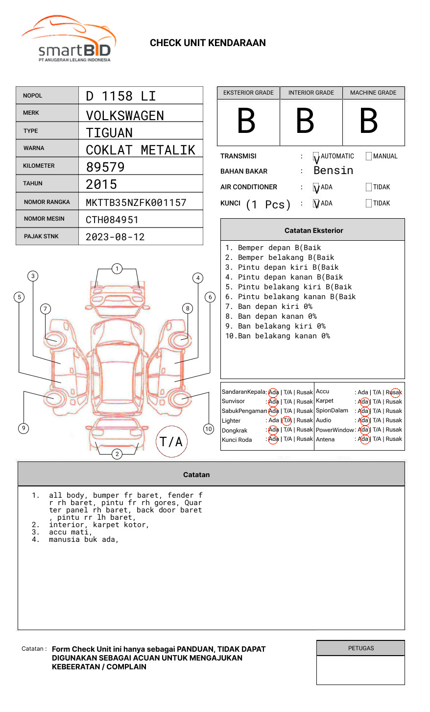 SEBELUM MELAKUKAN PENAWARAN UNIT PESERTA LELANG WAJIB MELAKUKAN PENGECEKAN UNIT DAN DOKUMEN TERLEBIH DAHULU // PIC DENNY : 0852-9442-5362 // UNIT DIKENAKAN BIAYA PPN 1.1% DARI HARGA TERBENTUK // KET E-SAMSAT "TELAH LEPAS KEPEMILIKKAN"// BEBERAPA DIGIT AWAL NOSIN FISIK TIDAK TERJANGKAU