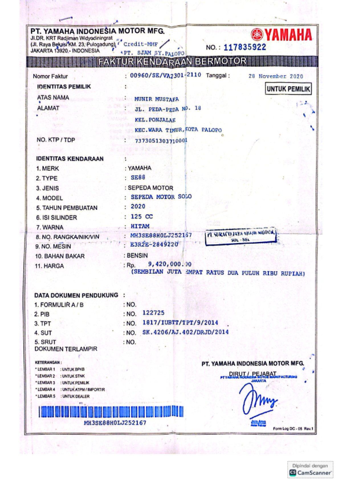 | No. Rangka | : | MH3SE88H0LJ252167 |