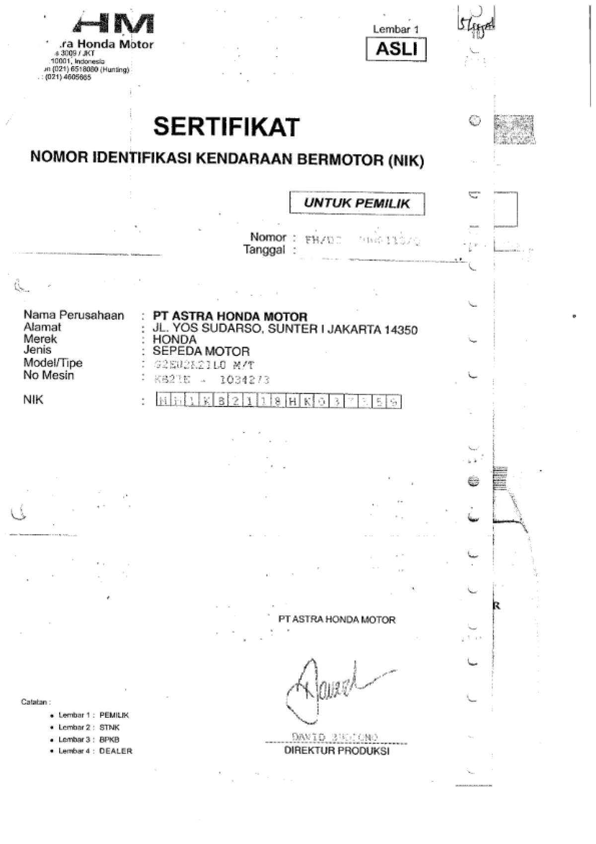 | No. Mesin | : | KB21E1034273 |