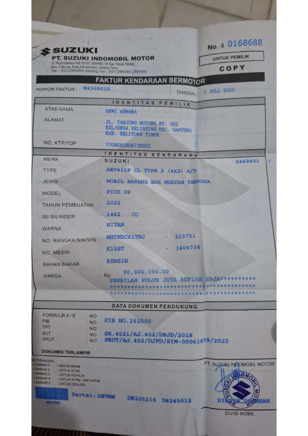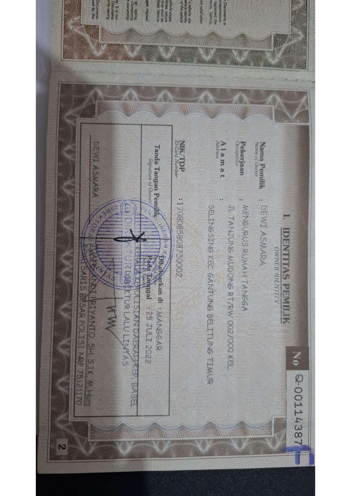 UNIT TIDAK DILAKUKAN PENGECEKAN OLEH TIM SMARTBID// SEBELUM MELAKUKAN PENAWARAN HARAP CEK KONDISI UNIT DAN DOKUMEN TERLEBIH DAHULU// WAJIB MENGHUBUNGI PIC DAN DATANG KE LOKASI UNTUK PENGECEKAN UNIT// UNIT DILELANG APA ADANYA PERMASALAHAN YANG TIMBUL DILUAR TANGGUNG JAWAB SMARTBID// PENGAMBILAN UNIT SLIDE H+2 DARI PELUNASAN // JIKA INGIN MENGAMBIL UNIT HARAP UNTUK KONFIRMASI DAHULU KE SMARTBID // JIKA YANG MENGAMBIL BIDDER HARAP MEMBAWA KTP ASLI // JIKA PENGAMBILAN DIWAKILKAN WAJIB MEMBAWA SURAT KUASA ASLI//UNIT DIKENAKAN BIAYA PPN 1,1% DARI HARGA TERBENTUK// HUBUNGI PIC TENI / 085266795101 // INFORMASI LENGKAP UNIT HUB CS PUSAT 0811119678//FOTO NOKA NOSIN TA HANYA ADA GESEKAN