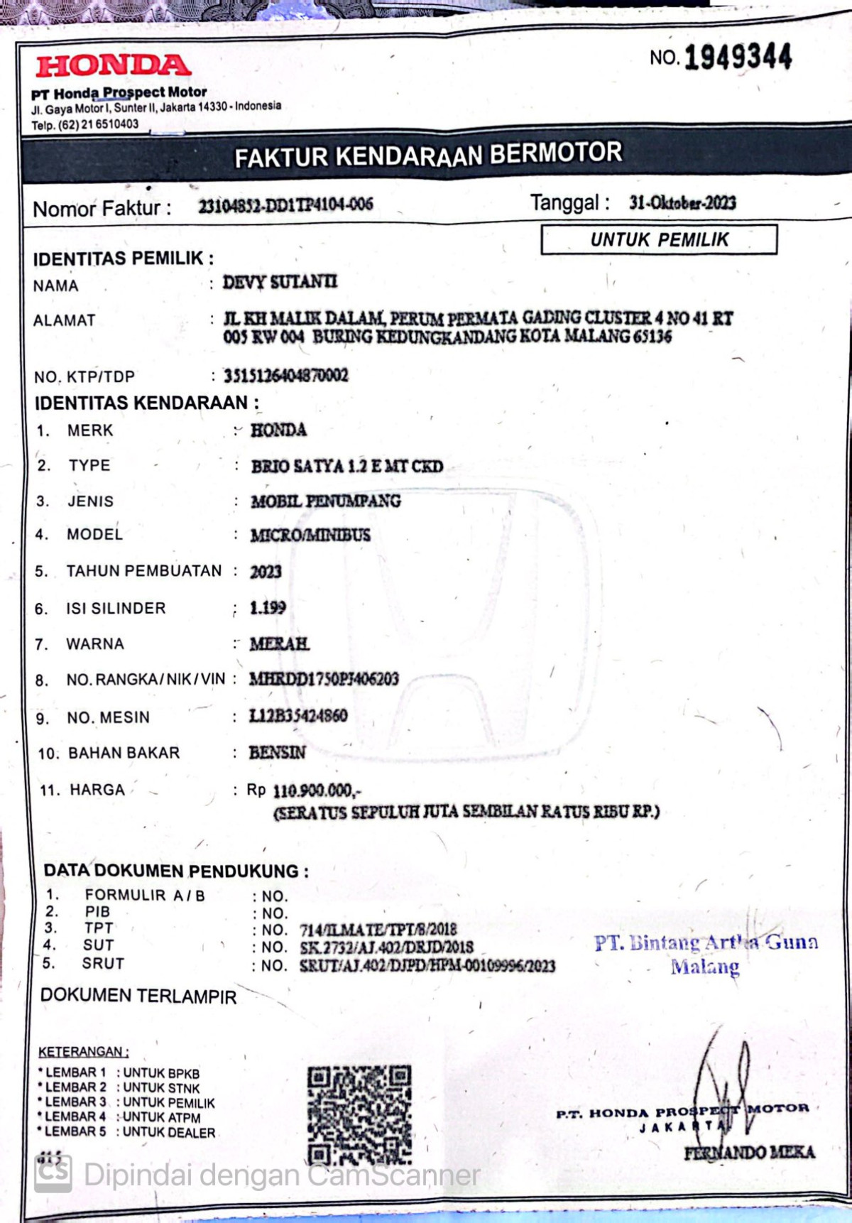 | No. Rangka | : | MHRDD1750PJ406203 |