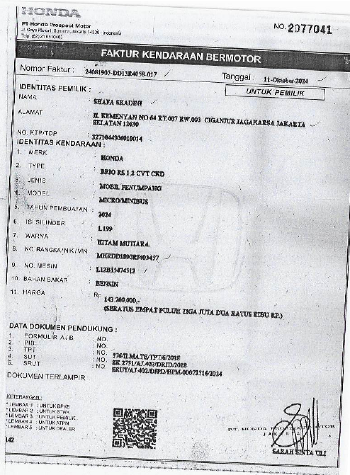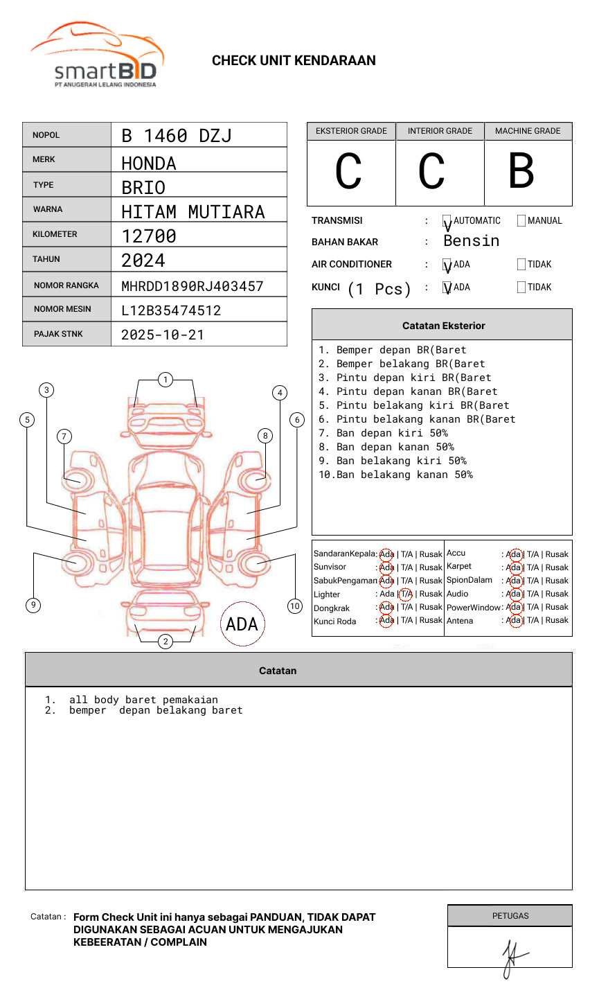 SEBELUM MELAKUKAN PENAWARAN UNIT PESERTA LELANG WAJIB MELAKUKAN PENGECEKAN UNIT DAN DOKUMEN TERLEBIH DAHULU //WANDA :62 858-6767-0166 // UNIT DIKENAKAN BIAYA PPN 1.1% DARI HARGA TERBENTUK // UNIT DIKENAKAN BIAYA ROYA FIDUSIA 100.000//FAKTUR BERUPA FOTOCOPY