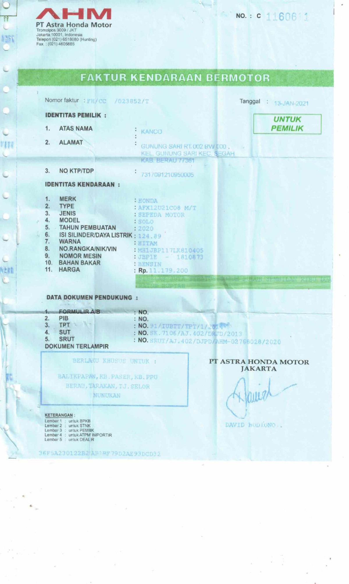 | No. Rangka | : | MH1JBP117LK810405 |