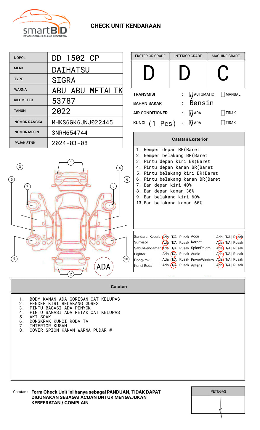 SEBELUM MELAKUKAN PENAWARAN UNIT PESERTA LELANG WAJIB MELAKUKAN PENGECEKAN UNIT DAN DOKUMEN TERLEBIH DAHULU // PIC RUDAL 0859-3010-9135 / MUHAMMAD DARWIS 082348587430 //