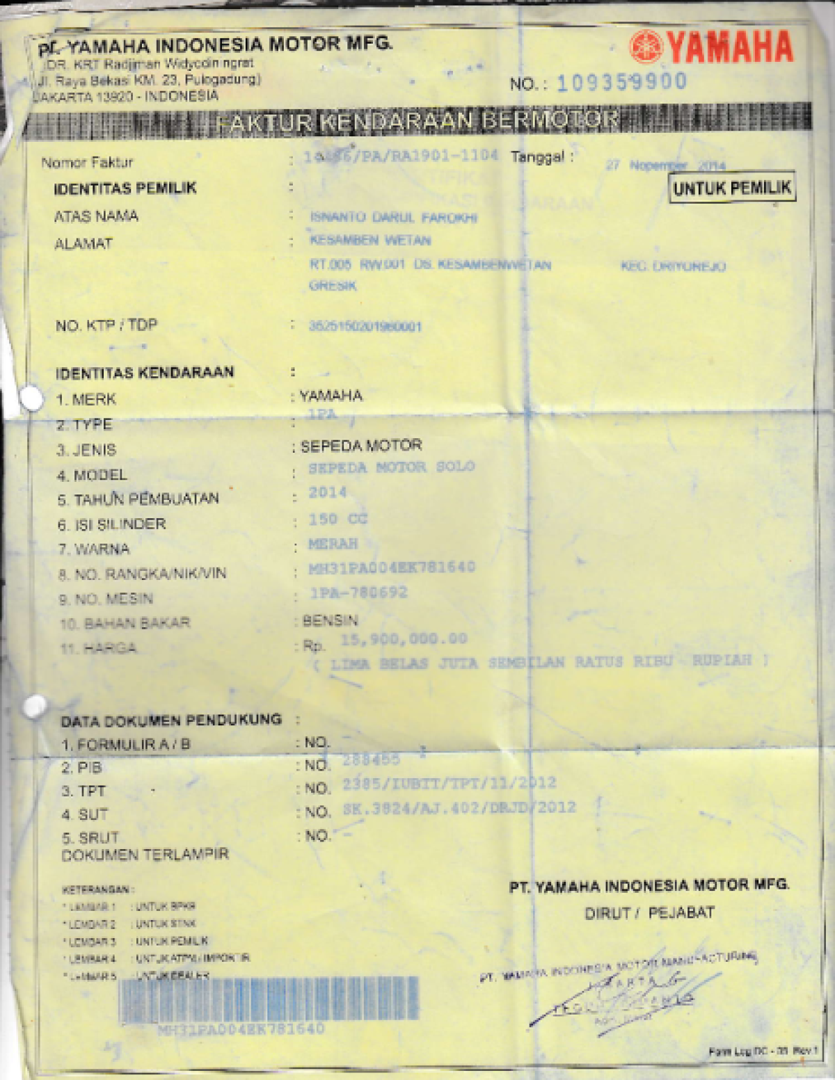 SEBELUM MELAKUKAN PENAWARAN UNIT PESERTA LELANG WAJIB MELAKUKAN PENGECEKAN UNIT DAN DOKUMEN TERLEBIH DAHULU // PIC RACHMAT :+62 821-4503-5002 // NOPOL FISIK DAN DOKUMEN BERBEDA / DI NOPOL FISIK "W 2056 CL" / DI DOKUMEN "W 4865 KC" / INDIKASI BBN GANTUNG // TAHUN KENDARAAN DI BPKB TIDAK ADA"